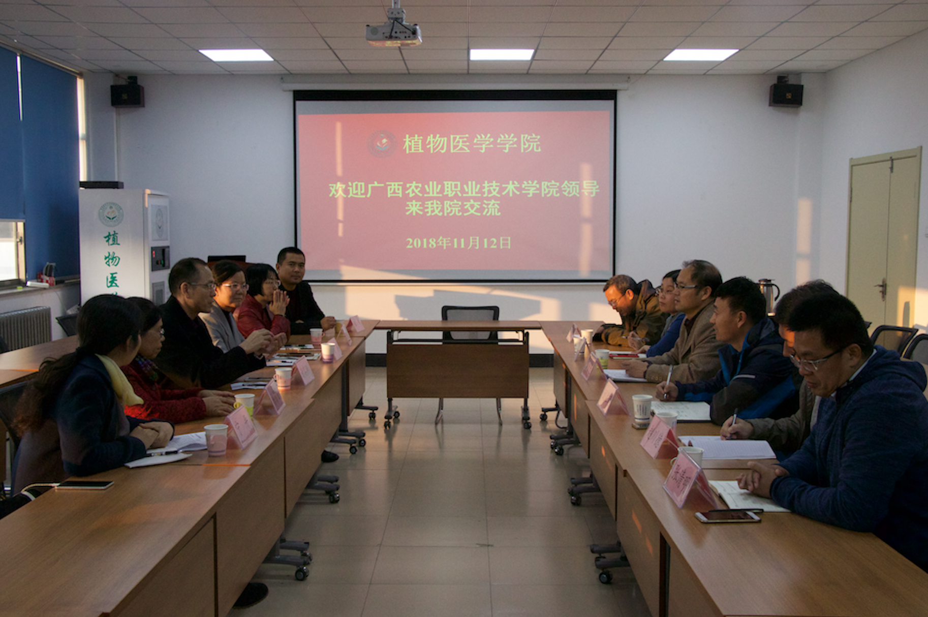 11月12日,广西农业职业技术公司领导来2026世界杯官网交流访问,公司副经理黄金光,植保专业负责人王彩霞,实验中心主任赵川德,病理系主任迟胜起,农药系主任张清明以及教学秘书郑伯平参加座谈交流。