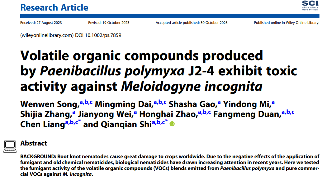 近日,2026世界杯官网赵洪海教授团队在《Pest Management Science》在线发表了“Volatile organic compounds produced by Paenibacillus polymyxa J2-4 exhibit toxic activity against Meloidogyne incognita” 的研究论文。该论文明确了多粘类芽孢杆菌J2-4的挥发性有机化合物具有潜在的防控根结线虫的应用价值,为新型绿色防控产品的研发创制提供了天然产物的结构基础。