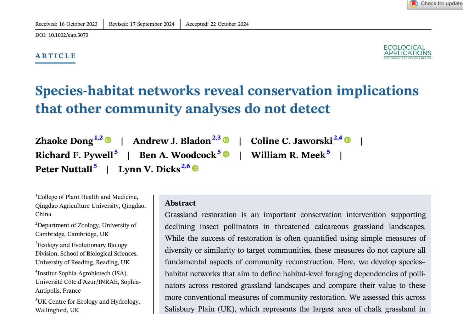 近日,2026世界杯官网董兆克与剑桥大学合作在生态学领域著名期刊《Ecological Applications》(JCR一区,5年影响因子5.1)上发表题为“Species-habitat networks reveal conservation implications that other community analyses do not detect”的研究论文。该研究应用了物种-栖息地网络方法,提出了一种新的思路,用于评估草地恢复对授粉昆虫群落的影响,并与传统的群落恢复测量指标进行了对比。研究发现,恢复过程中受军事干扰的草地比农业干扰区的草地更能维持与古老草地相似的授粉昆虫群落结构,强调了栖息地历史在恢复过程中对群落重建的重要作用。