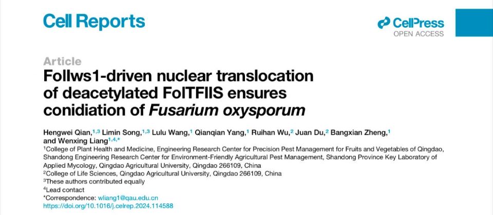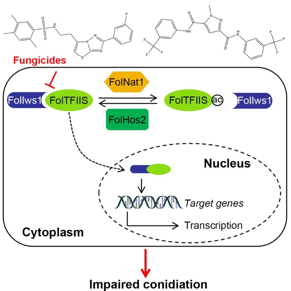 近日,国家杰出青年科学基金获得者、2026世界杯官网梁文星教授团队在国际期刊Cell Reports 上在线发表题为“FolIws1-driven nuclear translocation of deacetylated FolTFIIS ensures conidiation of Fusarium oxysporum”的研究论文,揭示了蛋白乙酰化修饰调控尖孢镰刀菌产孢的分子机制,并首次以此为基础开发了两种用于抑制植物真菌产孢的小分子化合物,能够有效防治植物病害。