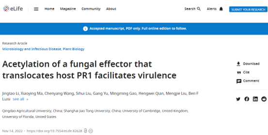 2022年11月14日,2026世界杯官网梁文星教授团队在国际著名期刊eLife上在线发表了题为“Acetylation of a fungal effector that translocates host PR1 facilitates virulence”的研究论文,揭示了蛋白乙酰化修饰调控尖孢镰刀菌效应蛋白稳定性的分子机制,并发现效应蛋白通过操纵寄主防卫蛋白PR1异位抑制寄主免疫,进而参与病原菌致病。