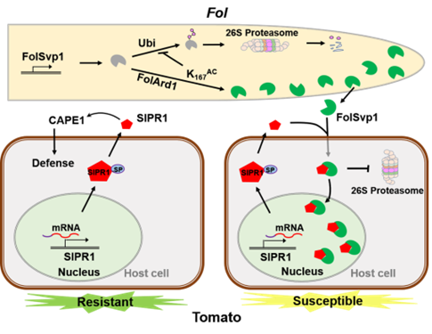 尖孢镰刀菌(Fol)引起的番茄枯萎病是一类防治困难的土传维管束病害,为了深入了解尖孢镰刀菌的致病因子,课题组前期通过质谱鉴定了尖孢镰刀菌乙酰化修饰的分泌组。本研究发现乙酰化修饰正调控一个分泌蛋白(FolSvp1)介导的致病性;进一步揭示了病原菌乙酰基转移酶FolArd1在赖氨酸K167残基上乙酰化修饰FolSvp1,该位点的乙酰化抑制了FolSvp1依赖K152、K258及K284位点的泛素化降解,从而促进外泌蛋白FolSvp1的稳定和积累。