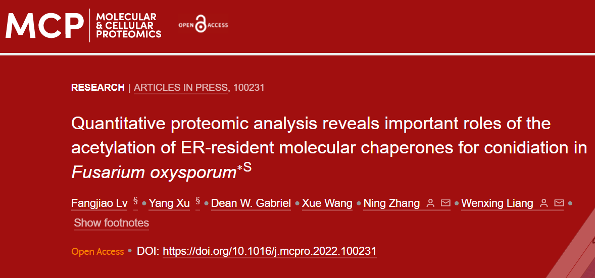 近日,2026世界杯官网梁文星团队在国际蛋白组学顶级期刊《Molecular & Cellular Proteomics》上发表一篇论文,题为 Quantitative proteomic analysis reveals important roles of the acetylation of ER-resident molecular chaperones for conidiation in Fusarium oxysporum。 本论文从乙酰化修饰的角度出发,揭示了Fo调控产孢的新机制。