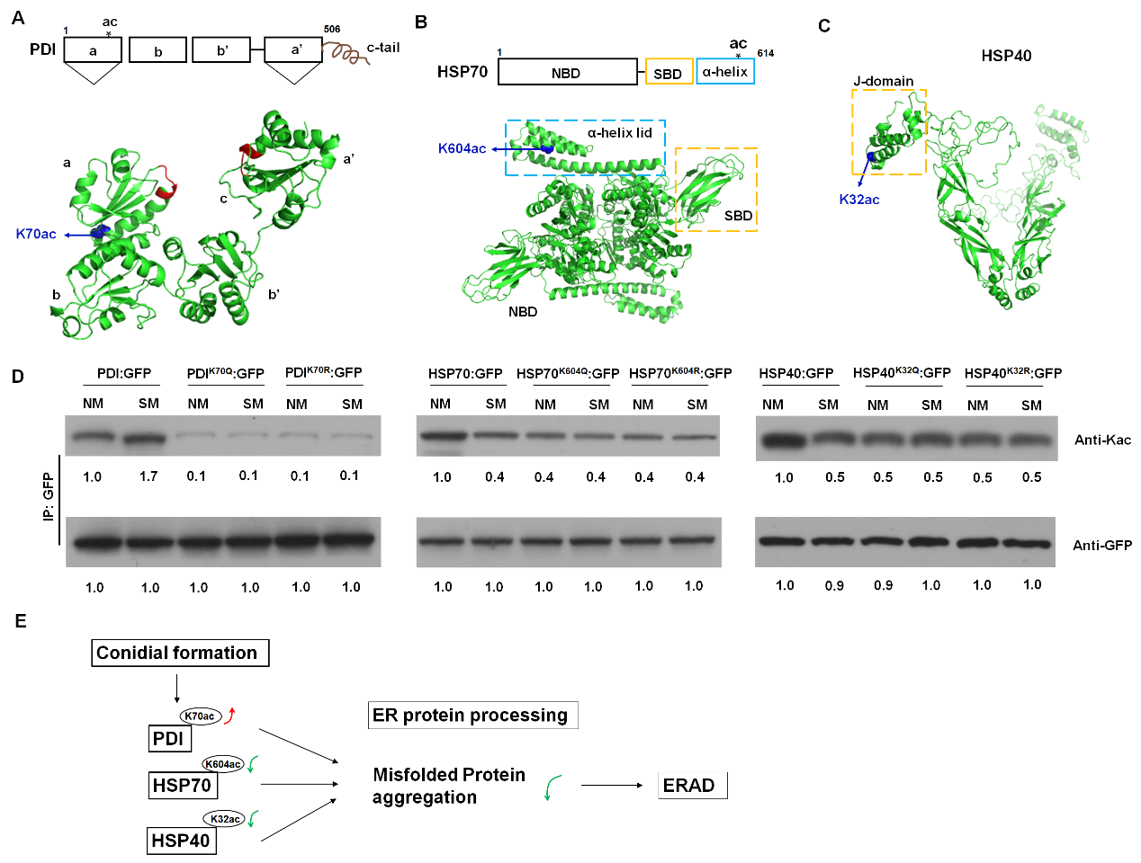 为了发掘可能影响产孢的乙酰化蛋白,该团队首先进行了定量乙酰化蛋白组的测定和分析,通过比较Fo产孢菌丝体(SM,sporulating mycelium)和非产孢菌丝体(NM,nonsporulating mycelium)中差异的乙酰化蛋白,共鉴定到62个上调和49个下调的Kac蛋白。这些差异的乙酰化蛋白显著富集于糖酵解途径、核糖体蛋白和分子伴侣蛋白。其中,三个定位于内质网的分子伴侣蛋白PDI、HSP70、HSP40的乙酰化水平的变化能够显著影响Fo分生孢子的产生。进一步的生化实验证明,K70ac对于维持PDI的蛋白稳定性和酶活至关重要;HSP70的K604ac和HSP40的K32ac抑制HSP蛋白的解毒能力,导致更高水平的蛋白聚集体的积累。在分生孢子形成过程中,PDIK70ac水平的增加和HSP70K604ac、HSP40K32ac水平的降低有助于未折叠蛋白质的正确加工和消除蛋白质聚集体的积累,这有利于Fo分生孢子形成过程中的细胞重塑。