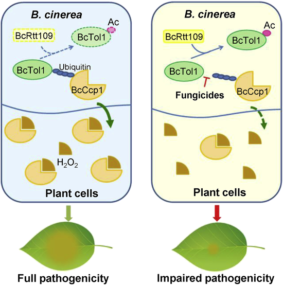 植物的活性氧迸发是受到病原体侵染后的一种快速的防御反应,可导致超敏反应和局部细胞死亡,阻止病原体的定殖。为应对植物的这一免疫反应,病原菌逐渐进化出了ROS的清除机制。鉴于ROS清除在病原菌侵染中的重要作用,该机制可作为植物病害防治的靶标,但目前该方面的开发应用尚无报道。梁文星教授团队以灰葡萄孢为对象进行研究,该病原菌可侵染1000多种植物,所造成的灰霉病是农业生产中的重大病害之一。该研究发现灰葡萄孢在侵染早期分泌细胞色素C氧化物酶(BcCcp1)以清除植物产生的H2O2,利于病原体入侵。而进一步实验表明,BcCcp1的外泌受泛素分选蛋白BcTol1调节。BcTol1是一个乙酰化蛋白,其转录、翻译及乙酰化水平在病原菌侵染早期受到严密调控。BcTol1和BcCcp1在侵染早期的互作促进BcCcp1的外泌,使得病原菌顺利侵染。
