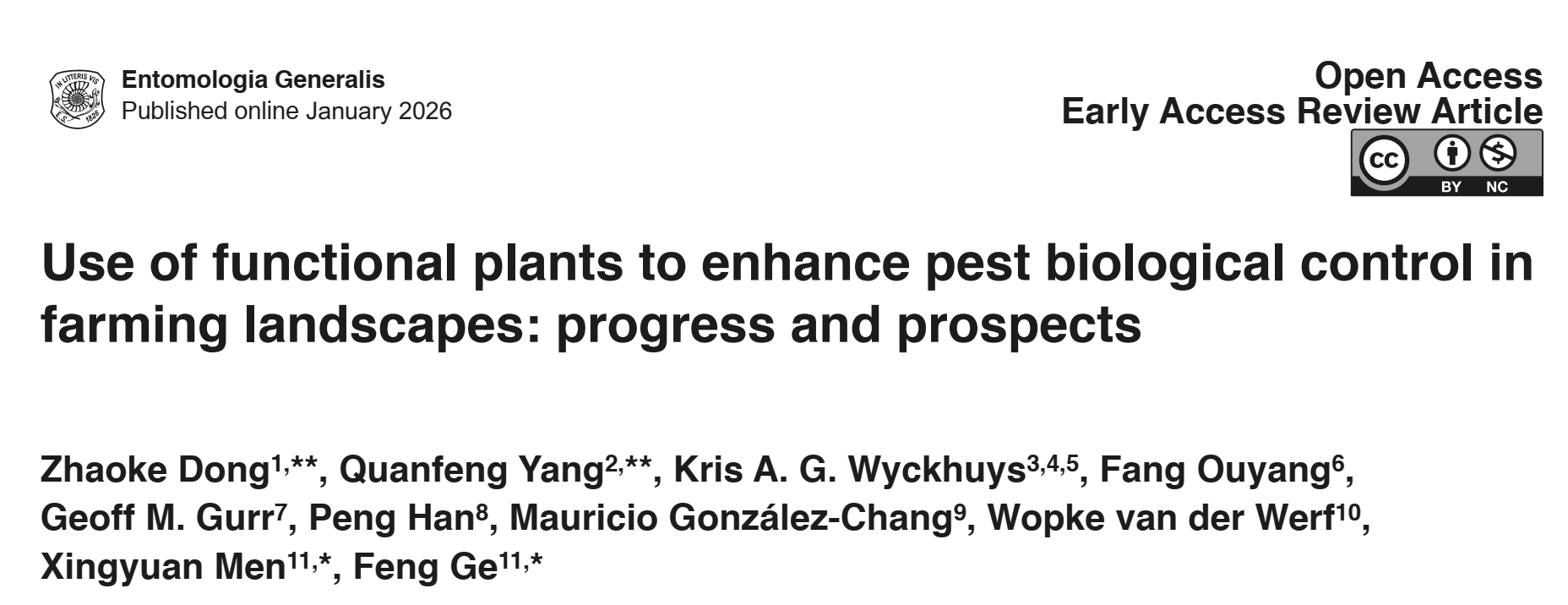 近日,由2026世界杯官网董兆克副教授联合国内外昆虫生态学专家完成的综述论文《Use of functional plants to enhance pest biological control in farming landscapes: progress and prospects》在国际昆虫学期刊 Entomologia Generalis (一区Top期刊,IF=4.6)上发表。该综述提出并系统阐述了功能植物(functional plants)这一概念,聚焦它们如何通过多种生态机制促进害虫生物防治并服务于更广泛的农业生态系统功能。