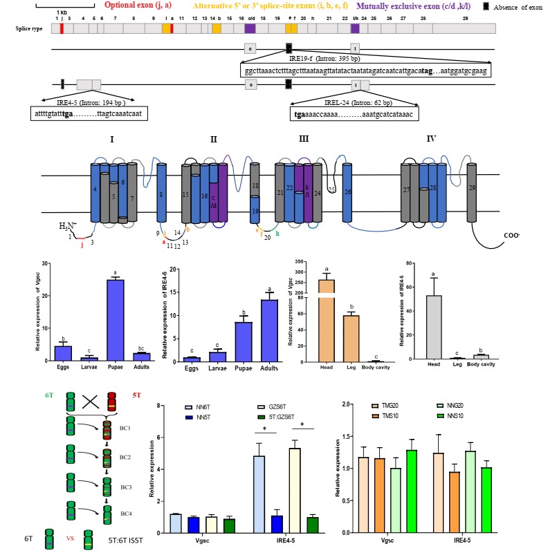 杀虫剂在主要农作物的保护中具有不可替代的地位,对保障全球粮食安全具有重要意义。目前,全球杀虫剂市场已超过200亿美元。然而,随着杀虫剂的广泛应用,害虫抗药性问题日益突出,导致许多常用杀虫剂的防治效果显著下降,甚至完全失效。这不仅给害虫的可持续治理带来严峻挑战,也对环境和食品安全构成潜在威胁。杀虫剂靶标的遗传变异是害虫抗药性的主要机制之一。过去的研究主要集中在靶标蛋白的氨基酸突变。然而,超过全球杀虫剂市场70%份额的杀虫剂靶标蛋白具有丰富的选择性剪接,这种现象通过改变编码区的剪接方式生成不同的转录本,可改变靶标蛋白的电生理和药理特性。常见的选择性剪接类型包括外显子跳读、可变供体或受体位点、互斥外显子和内含子保留。其中,内含子保留剪接长期以来被忽视,近年来随着高通量测序技术的发展,它在生物抗逆和药物抗性的作用逐渐得到认可。然而,目前关于杀虫剂靶标的内含子保留及其与杀虫剂毒理学关系尚不清楚。