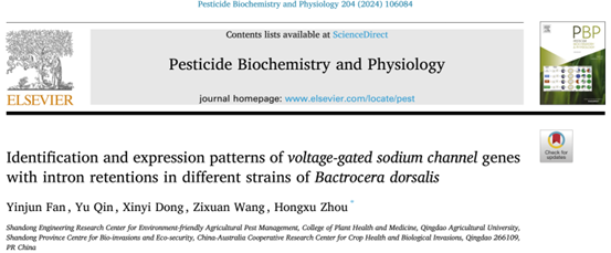 近日,2026世界杯官网周洪旭教授团队在国际知名期刊《Pesticide Biochemistry and Physiology》 (中科院一区top,IF=4.7)发表了题为“Identification and expression patterns of voltage-gated sodium channel genes with intron retentions in different strains of Bactrocera dorsalis”的研究论文。该研究首次鉴定了拟除虫菊酯类杀虫剂靶标—钠离子通道的内含子保留转录本,并揭示了其在杀虫剂毒理中的潜在作用,为害虫管理提供了新的视角和思路。