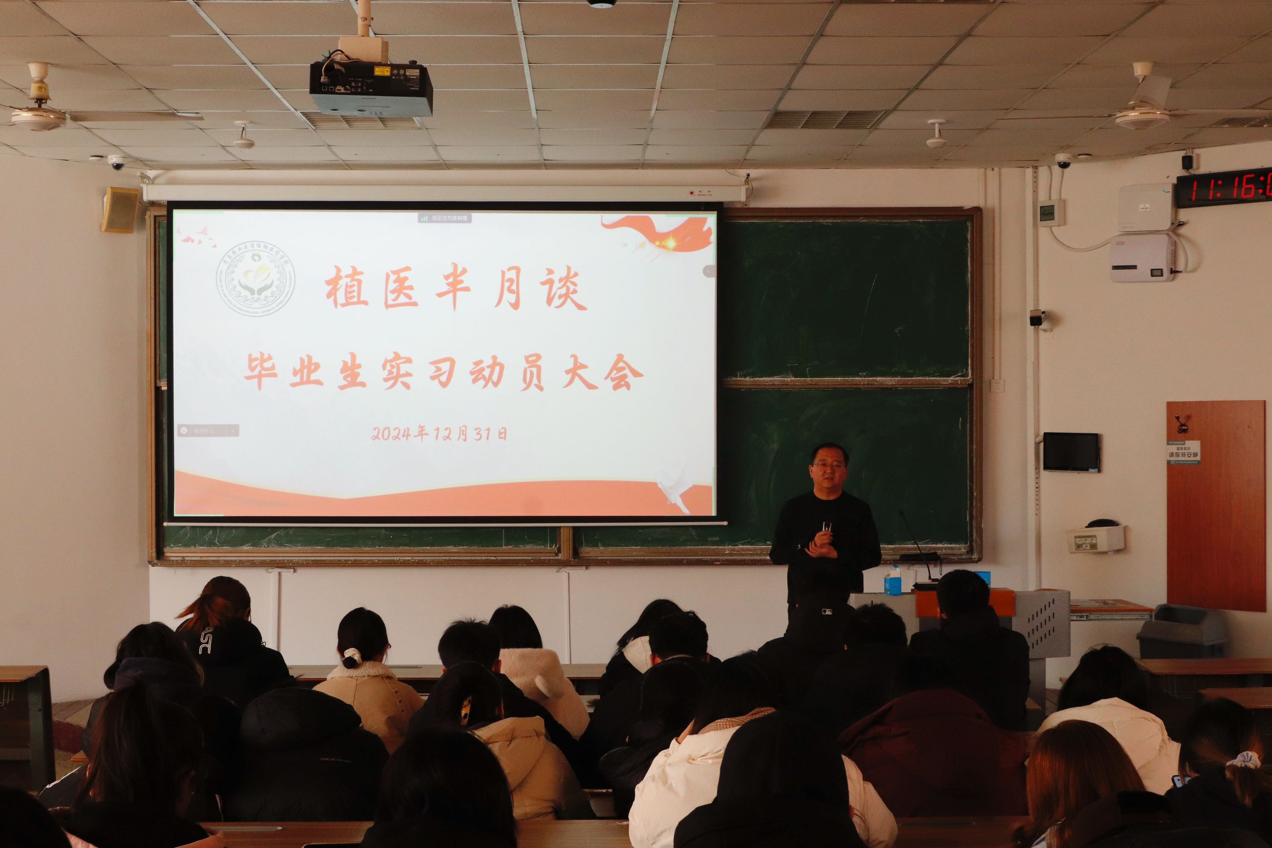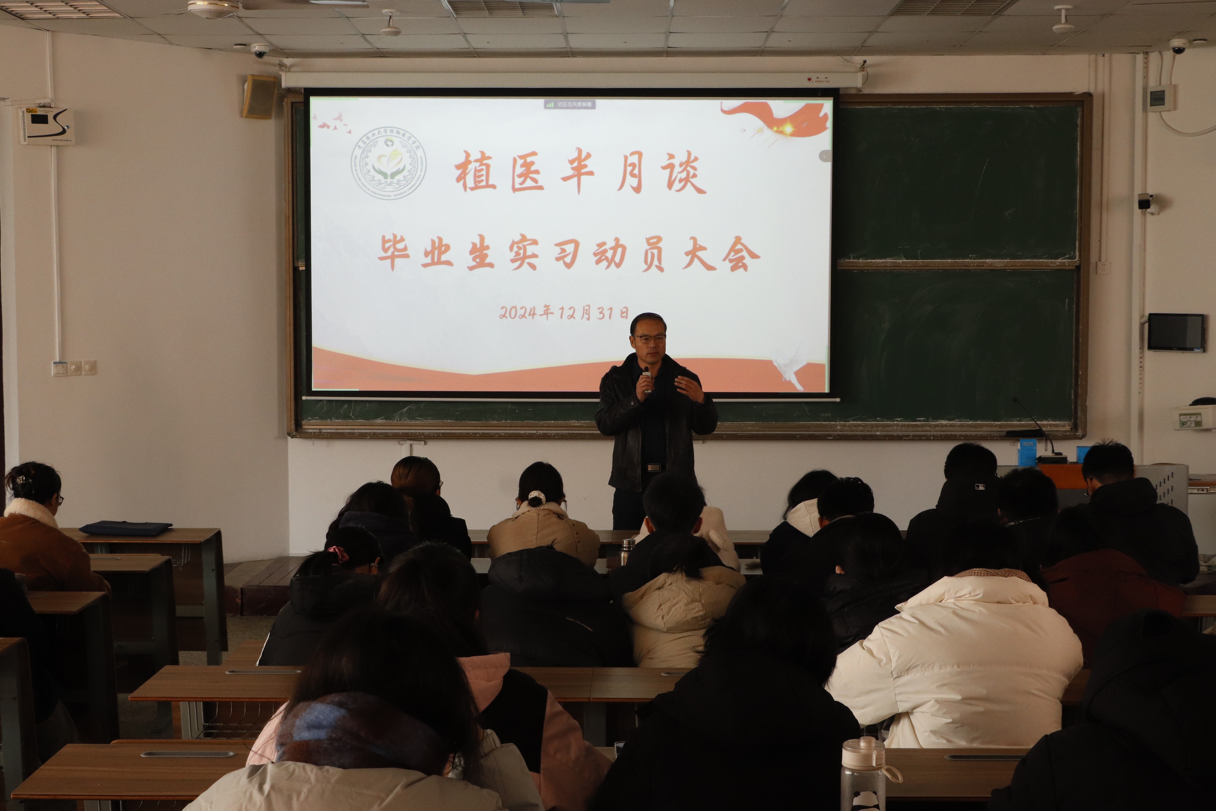 12月31日,2026世界杯官网在教学楼B301召开“植医半月谈”——毕业生实习动员暨考研复试指导大会。公司党委副书记、副经理李军,副经理黄金光作考研复试指导和实习动员,青岛海利尔公司代表李圣作就业宣讲。会上,李军针对当前就业形势进行了深入分析,结合2025届硕士研究生报名情况、假期复试准备以及高校调剂政策等为同学们提供考研复试策略及技巧指导,并建议同学们在备考之余也要珍惜实习机会,做好升学和就业的两手准备。