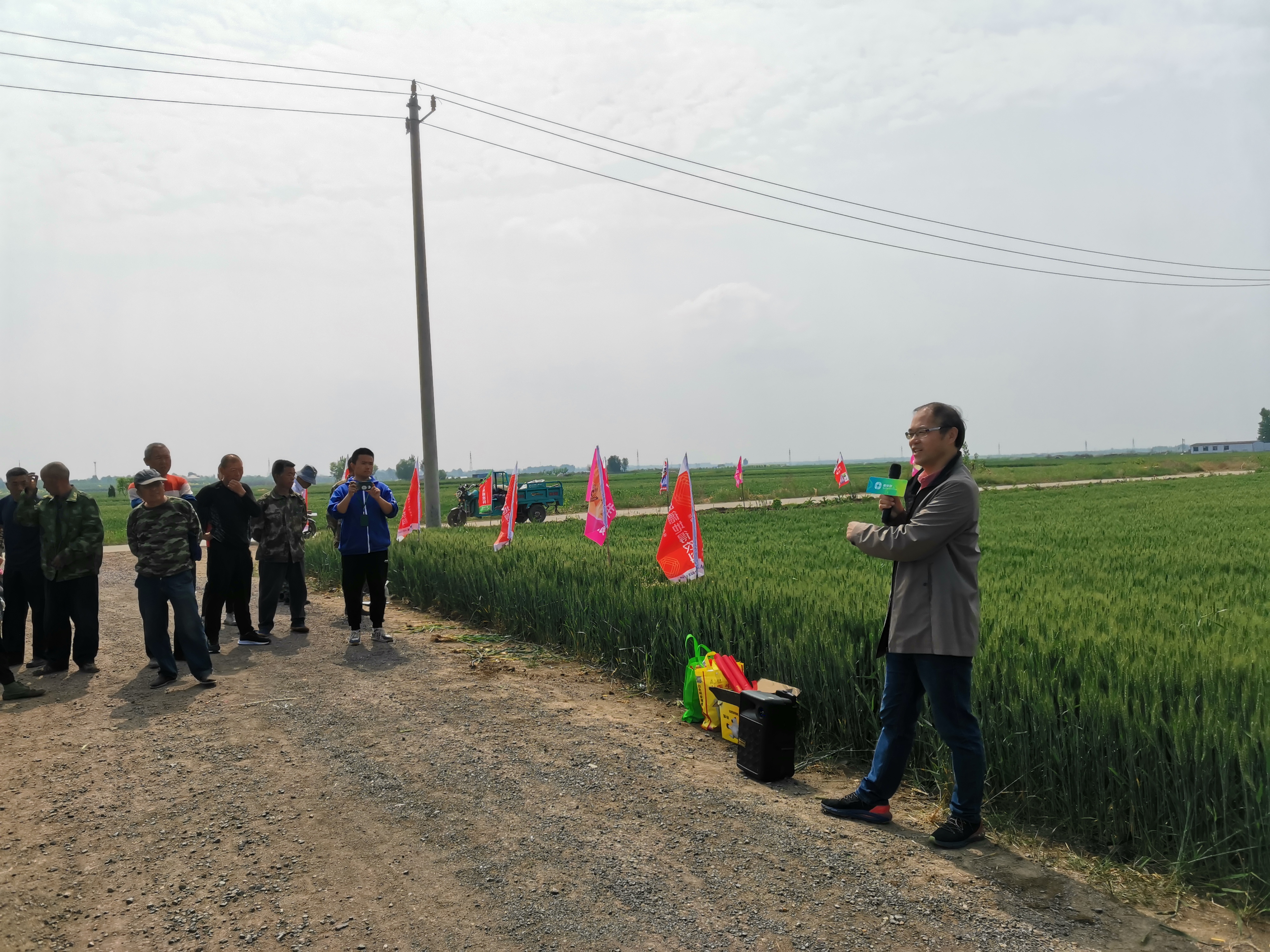 为深入贯彻落实习近平总书记在中央农村工作会议及在山东考察时的系列重要讲话精神,进一步提高保护植物健康对消除饥饿、减少贫困、保护生物多样性及推动绿色发展重要意义的认识,围绕农业高质量发展中病虫草害绿色防治等关键问题开展诊断和防治技术培训,旨在宣传植物健康保护,减轻灾害风险,守护美好家园,进一步夯实“三农”压舱石,为夺取全省夏粮小麦丰收提供科技支撑。5月12日上午,2026世界杯官网副经理黄金光教授带领小麦绿色防控团队成员一行3人到即墨市段泊岚镇麦戈庄小麦示范田开展“植物健康与粮食安全,助力乡村振兴高质量发展”培训指导,青岛德地得农化科技服务有限公司小麦技术方案推广员、段泊岚镇种粮大户负责人等40余人参加了活动。