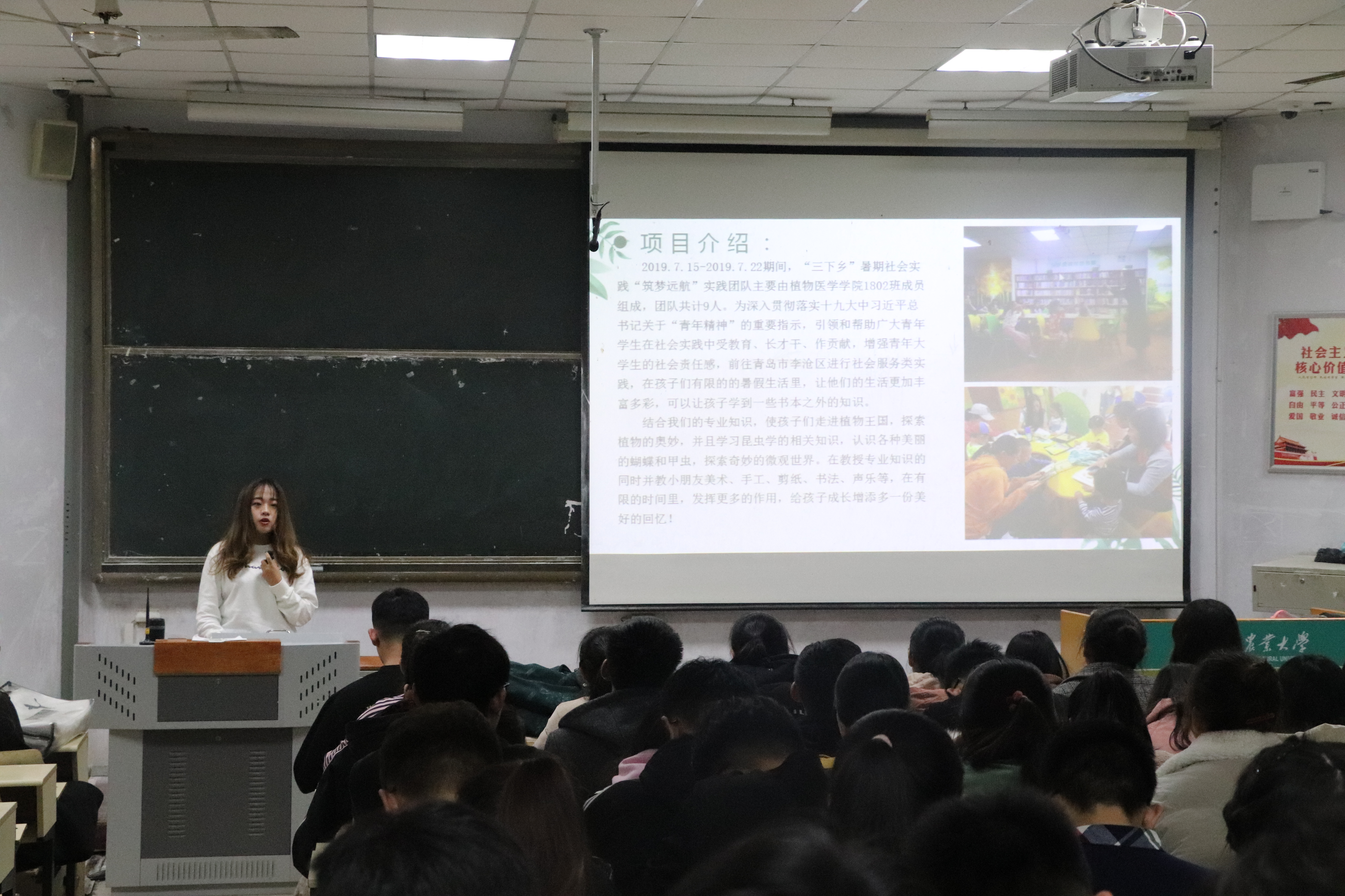 会上,植保D1801班张浩楠、黄衡,植保1802班于智欣分享了她们所在团队支教的前期准备,支教内容,后期宣传等方面的相关经验;植保1801班韩蕊分享了崂山林业有害生物调查的实践经历;植保1701孔令浩分享了作物线虫及其防控市场的实践经历以及团队后期宣传工作的开展过程;植保1804李梦涵介绍了农药使用安全大使的相关工作;植保1802刘晓雨为2019级同学详细讲解了第二课堂相关工作。会上,在场同学踊跃发言,提出了社会实践相关的诸多问题,学长学姐一一耐心解答。