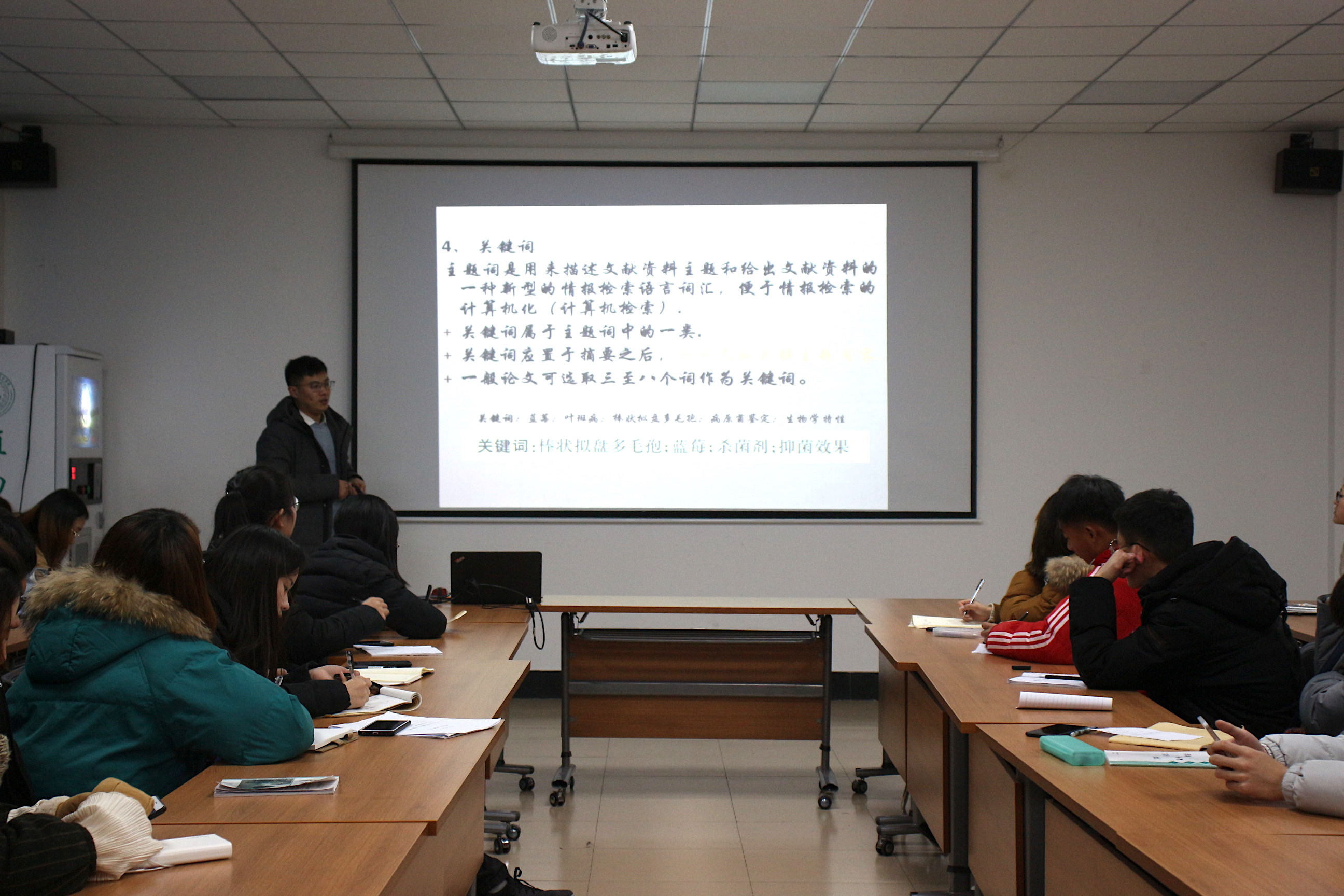 培训会上,薛德胜首先讲述了学术论文的概念。他就论文选题应该遵循的几项原则作出了阐述,他表示论文要考虑可行性、合理性,要有创造性、新颖性,兼顾兴趣的同时也要联系实际。随后薛德胜从了论文的格式出发,从“题目”、“作者及单位”、“摘要”和“关键词”等八个方面详细的讲解了如何使论文写作规范。他强调论文注重精简,内容要浓缩,要避免篇幅冗长。最后,他为同学们介绍了一些查找文献的方法。