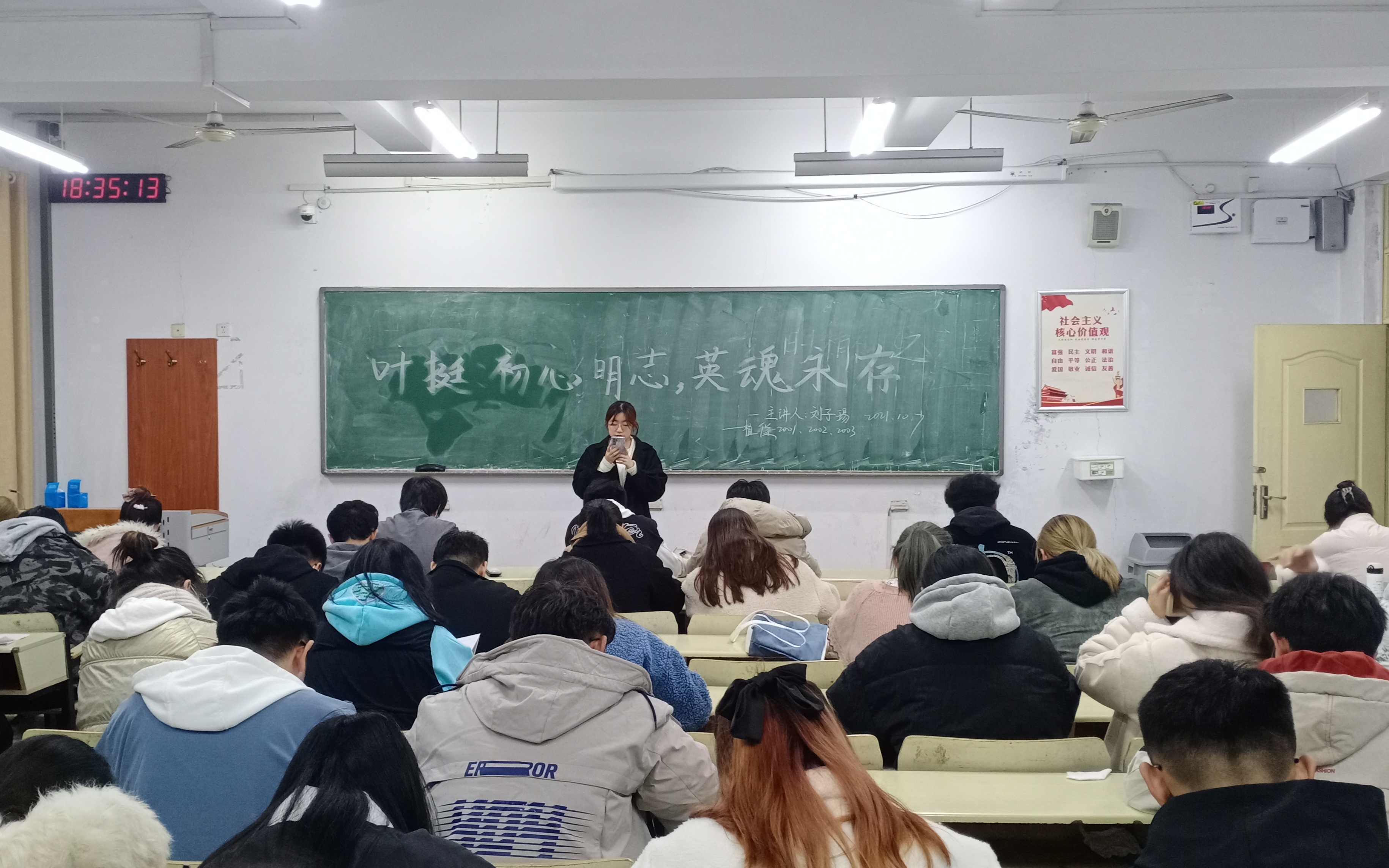 主讲人讲到,叶挺精神,就是不怕牺牲,不屈不挠,坚持信仰与真理,视死如归;就是甘愿为革命事业而献身的精神,宁愿牺牲自己也不和敌人同流合污、做出有悖革命的事;也包括以“铁的信念,铁的作风,铁的纪律,当尖兵、打硬仗、打不垮、拖不烂的革命志气”为主要内容的“铁军”精神。学习叶挺精神,要求我们在纪律方面,以叶挺精神要求自己,要有“铁的作风,铁的纪律”,遵守校纪班规,为建设先进班级贡献自己的力量;在体育锻炼方面,也要以叶挺精神要求自己,要有“当尖兵、打硬仗、打不垮、拖不烂的革命志气”,做到不怕苦,不怕累;在学习方面,要有“不屈不挠,坚持信仰与真理”的叶挺精神;树立远大的理想,并为理想作出坚持不懈地努力。以认真的态度、刻苦的精神去克服学习上的各种困难。信仰之光不灭,理想之火不熄!