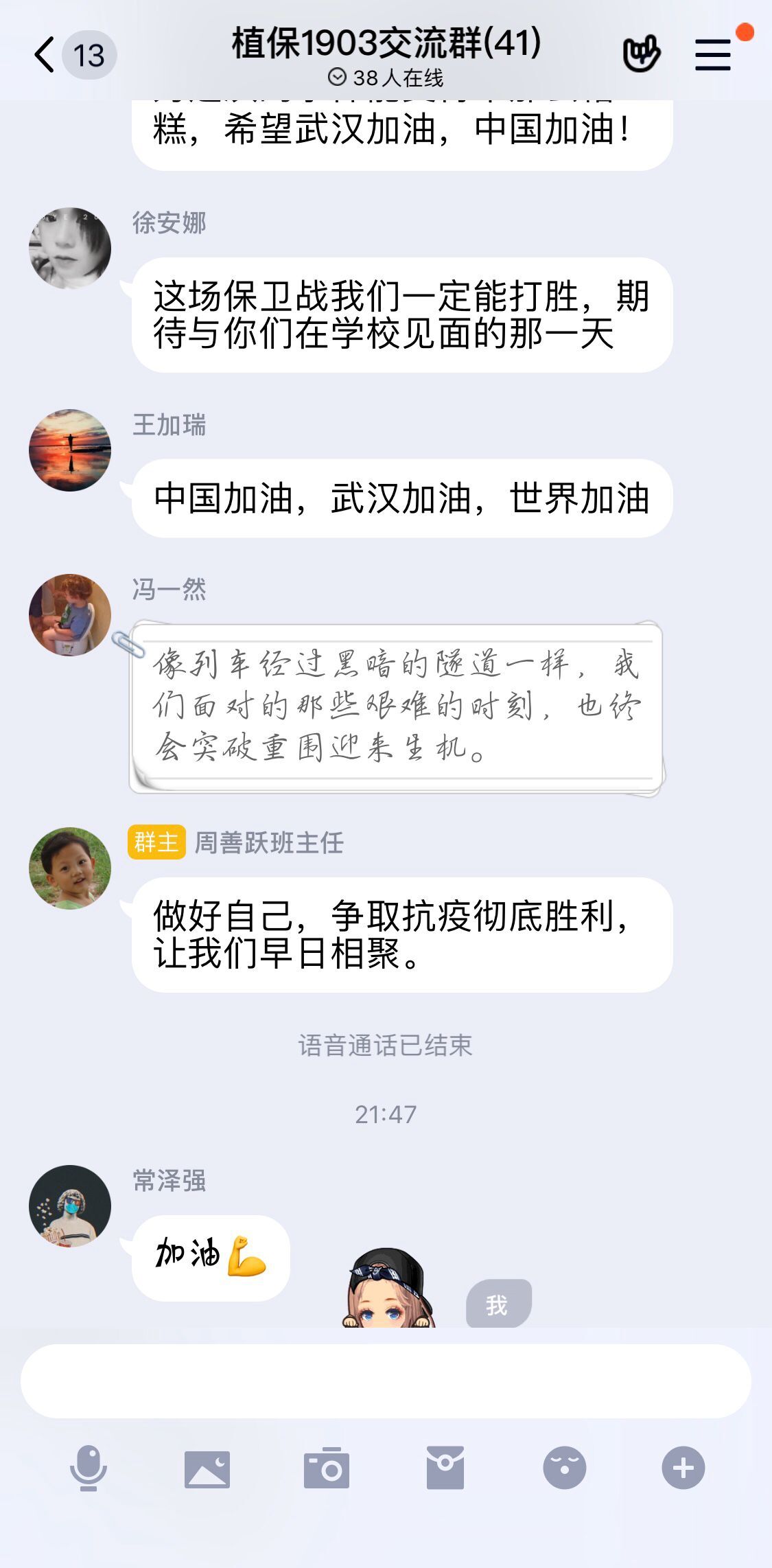 本次班会,在各班班主任带领下,通过腾讯会议、学习强国、群课堂、微信等即时通讯软件开展,各班班主任就目前疫情情况向班级同学做出说明,鼓励同学们乐观应对疫情影响,提醒同学们做好防护措施,出门带口罩,少聚集,勤洗手,不信谣,不传谣,遵守公司安排,严禁提前返校,及时上报防疫信息,按时学习网络课程。各班级班主任一致强调,要坚决贯彻落实习近平总书记重要指示精神,学习党中央的重大决策部署,弘扬新时代爱国主义精神,提高自身政治意识、培养理性思维;增强法律意识,培养责任担当;坚定信心、同舟共济;科学防治、听从指挥、打好、打赢疫情攻坚战。