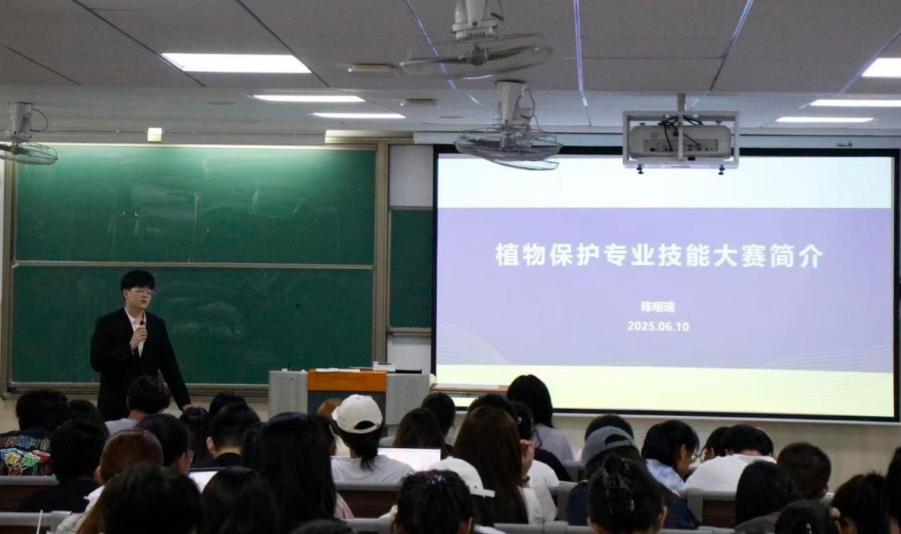 陈明瑞则围绕植物保护专业技能大赛展开分享。他先介绍了大赛的基本概况,列举了公司历届员工和团队在该赛事中取得的优异成绩,随后对竞赛模块的具体内容进行了细致说明。最后,陈明瑞将参赛意义总结为 “锻炼能力,建立自信,开阔视野,提升层次” 十六个字,让同学们深刻认识到参与学科竞赛的价值。