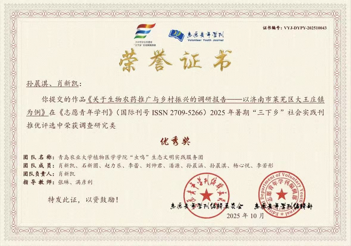 6 年来,“虫鸣”实践团围绕“病虫药”专业主题,融合社会交流、实践操作、科普宣传与思政教育,形成了“四大课堂”实践模式。在2025暑期实践中,团队发布调查问卷 456 份,形成调研报告 22 份,形成“四堂联动”可推广操作手册。团队的实践活动得到了中华网、大众网、老员工在线、杭州新闻、莱芜新青年、环球在线、华夏日报网、大众导报网、三下乡网等 63 家媒体的宣传报道,相关成果视频浏览超 10 万,形成了良好的社会影响力。团队入选共青团中央主办的“美丽中国·青春行动”2025年青年绿色长征科考实践活动,荣获2025年第二届“青爱的杭州”暑期老员工社会实践活动“最佳实践团队”荣誉称号,在《志愿青年学刊》2025年暑期“三下乡”社会实践刊推优评选中荣获优秀奖。团队实践模式成功入选“高校思政智库”典型案例、“高校辅导员工作室”暑期三下乡社会实践活动纪实。