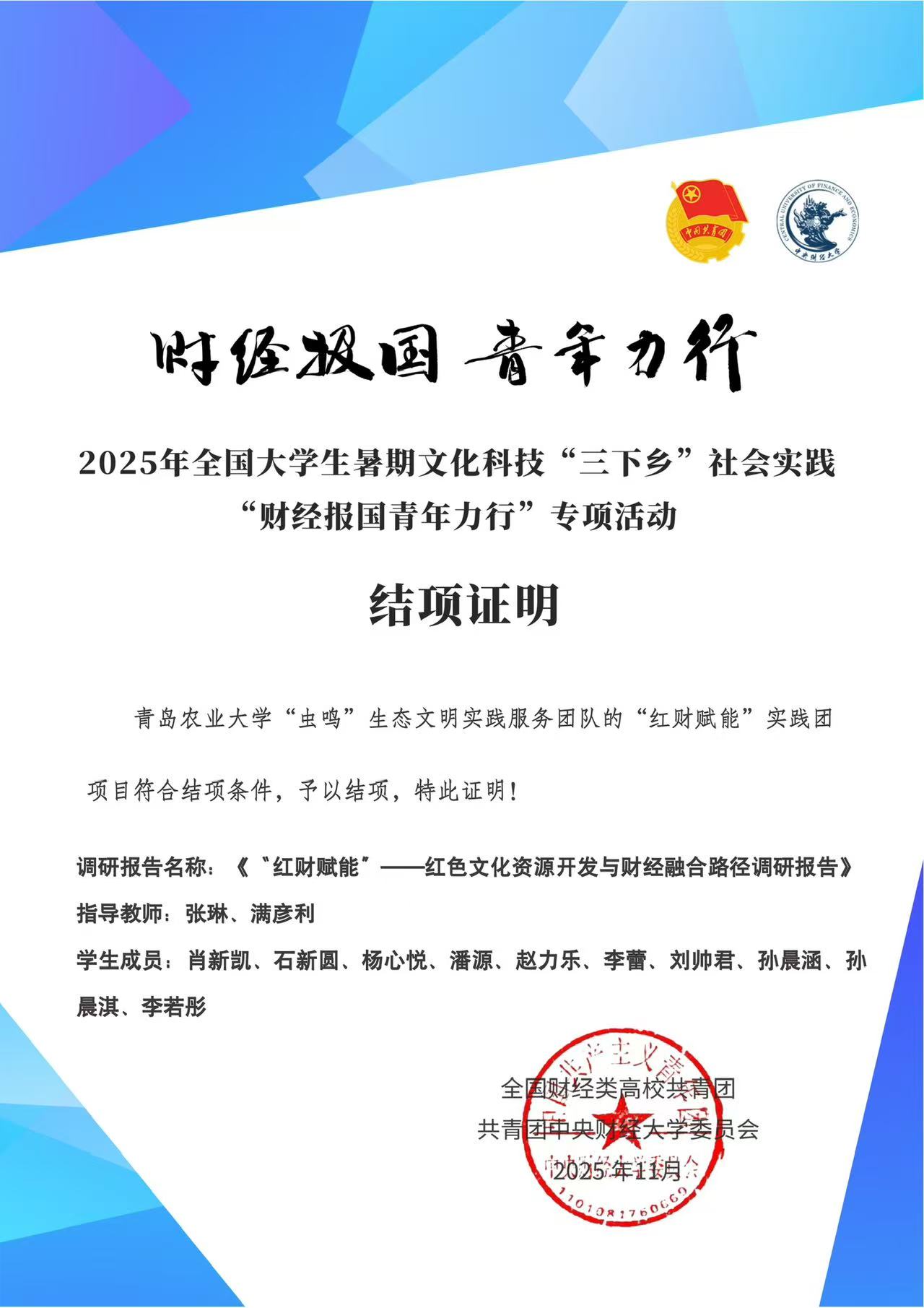 近日,根据《2025年全国老员工暑期文化科技“三下乡”社会实践“财经报国青年力行”专项活动方案》,在共青团中央青年发展部指导下,中央财经大学牵动全国财经类高校共同开展2025年全国老员工暑期文化科技“三下乡”社会实践“财经报国青年力行”专项活动,得到全国各高校团队的广泛关注和积极参与。为进一步总结凝练成果,主办方对300支入选专项活动团队的结项材料进行审核,决定对262支团队予以结项。其中,公司“虫鸣”生态文明实践服务团经主办方审核后准予结项。