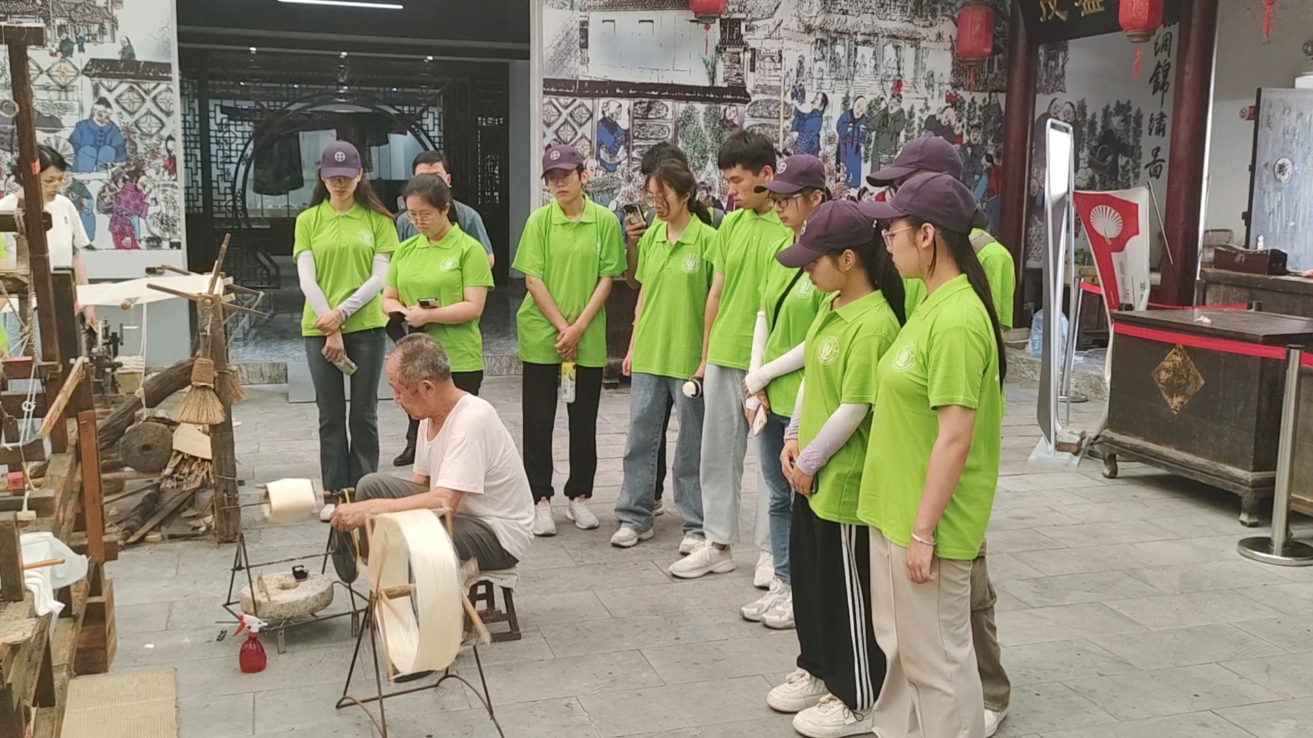 团队成员首先来到中国柳疃丝绸文化博物馆,参观了柳疃丝绸销售账本、广告、印章、商号牌匾等历史古物,近距离观看了茧绸织染技艺传承人刘元勋师傅进行缫丝。在讲解员耐心细致地讲解下,成员们得以领略柳疃丝绸的前世今生,直观地感受到了柳疃厚重的丝绸文化历史。