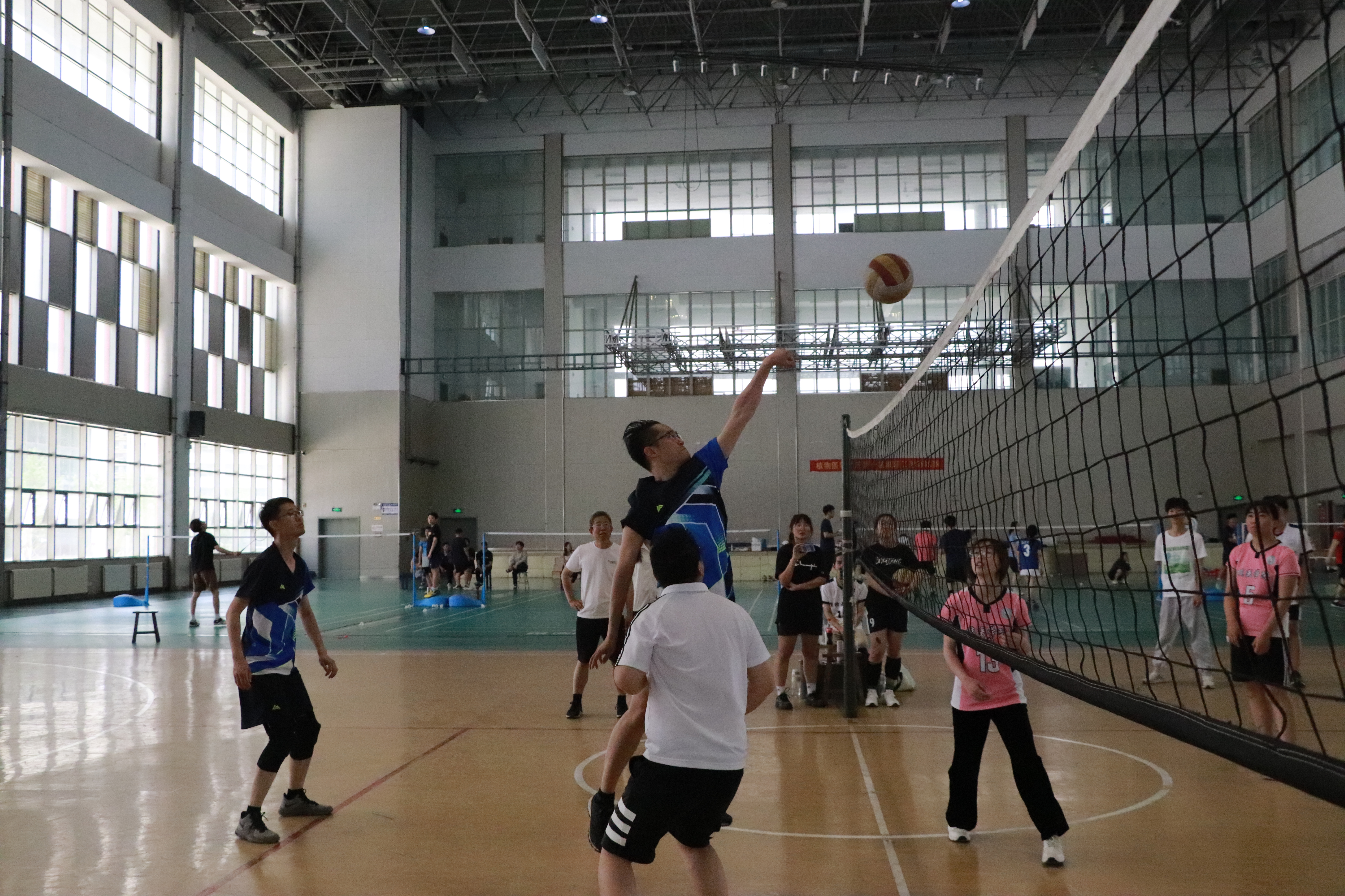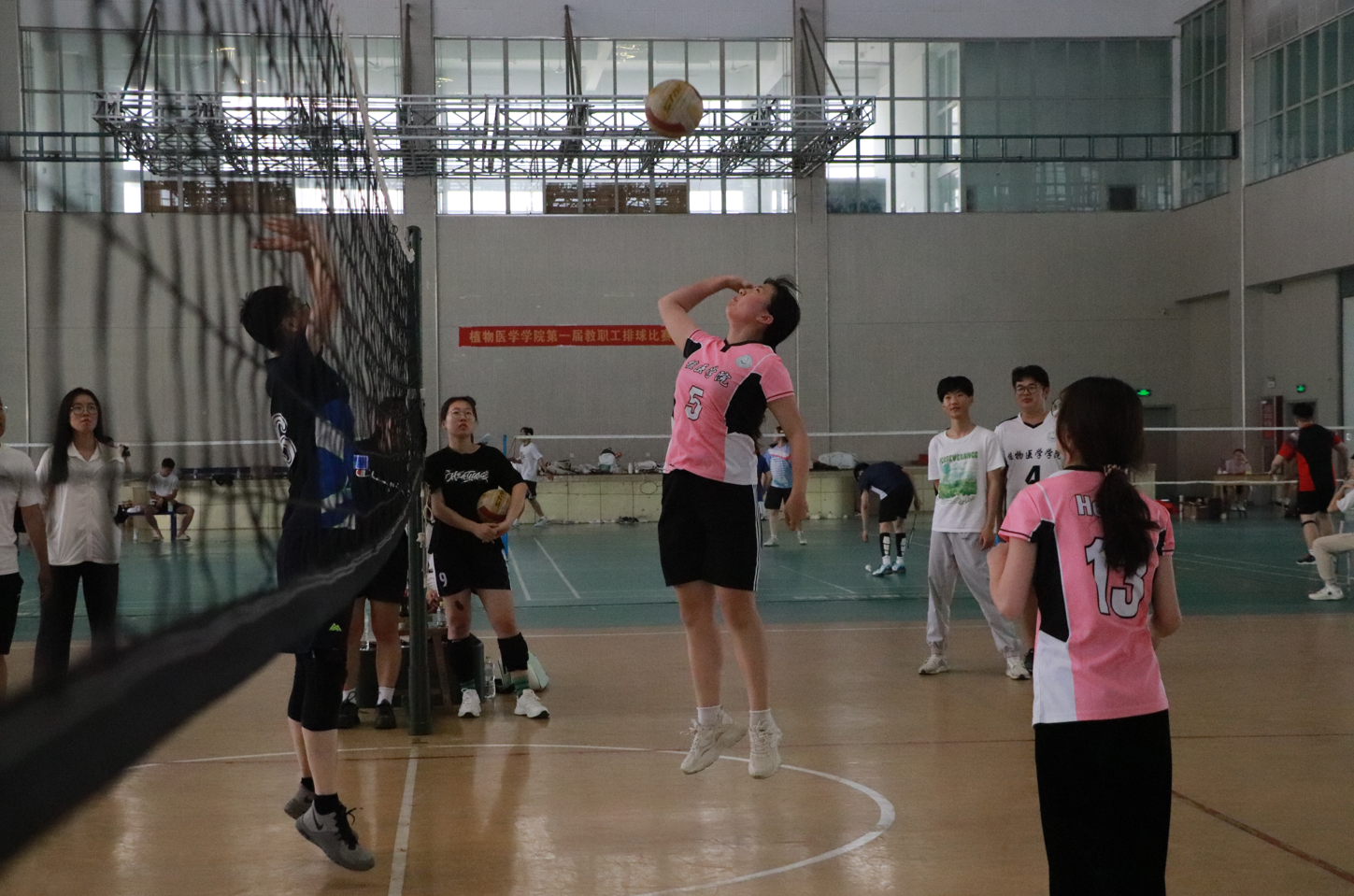 排球场上,党委委员、副经理赵洪海,党委委员张彬、周洪旭教授等教师代表队与员工代表队展开了激烈的角逐,员工们意气风发展现出蓬勃朝气,教师们也不甘示弱,凭借高超的球技和默契的配合2比1赢得比赛。比赛现场欢呼不断,气氛热烈。