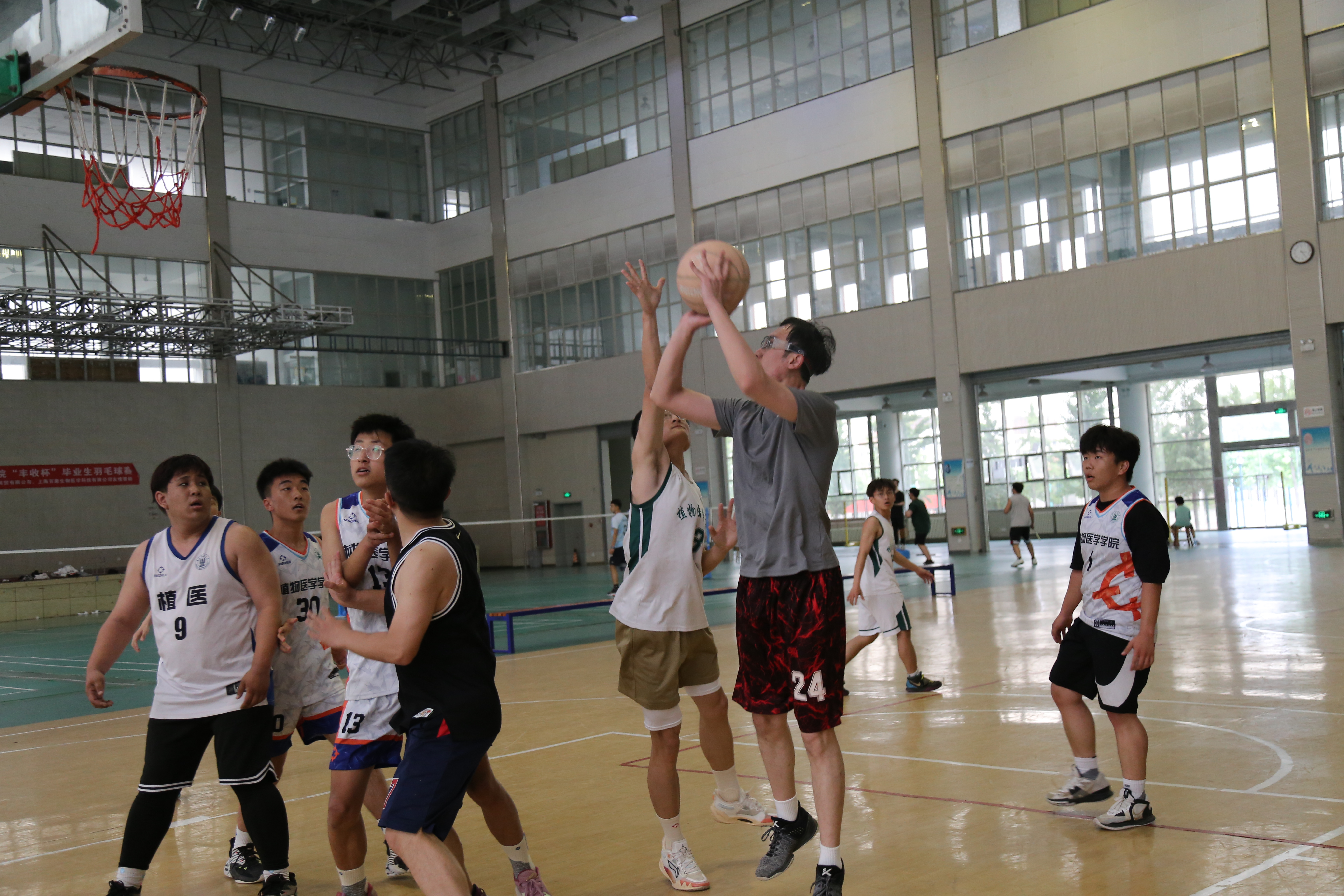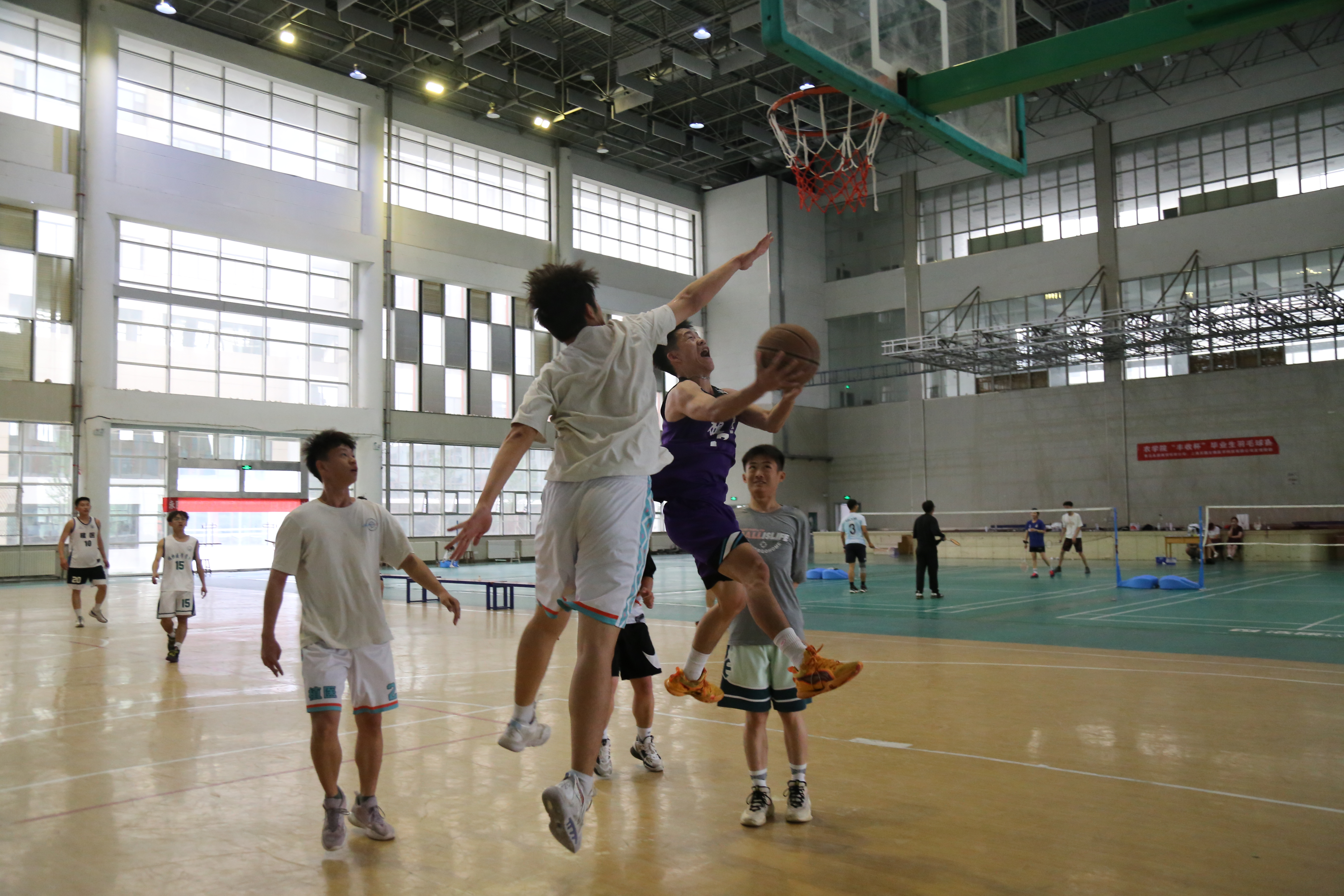 篮球场上,任维超老师、杨坤老师、毕业生和低年级员工代表自由组队,他们快速抢断、默契传球、精准投篮,他们不以输赢为目的,而是在球场上尽情享受团队配合的快乐,加深彼此间的情谊。比赛高潮迭起、精彩激烈,呐喊声、加油声不绝于耳。