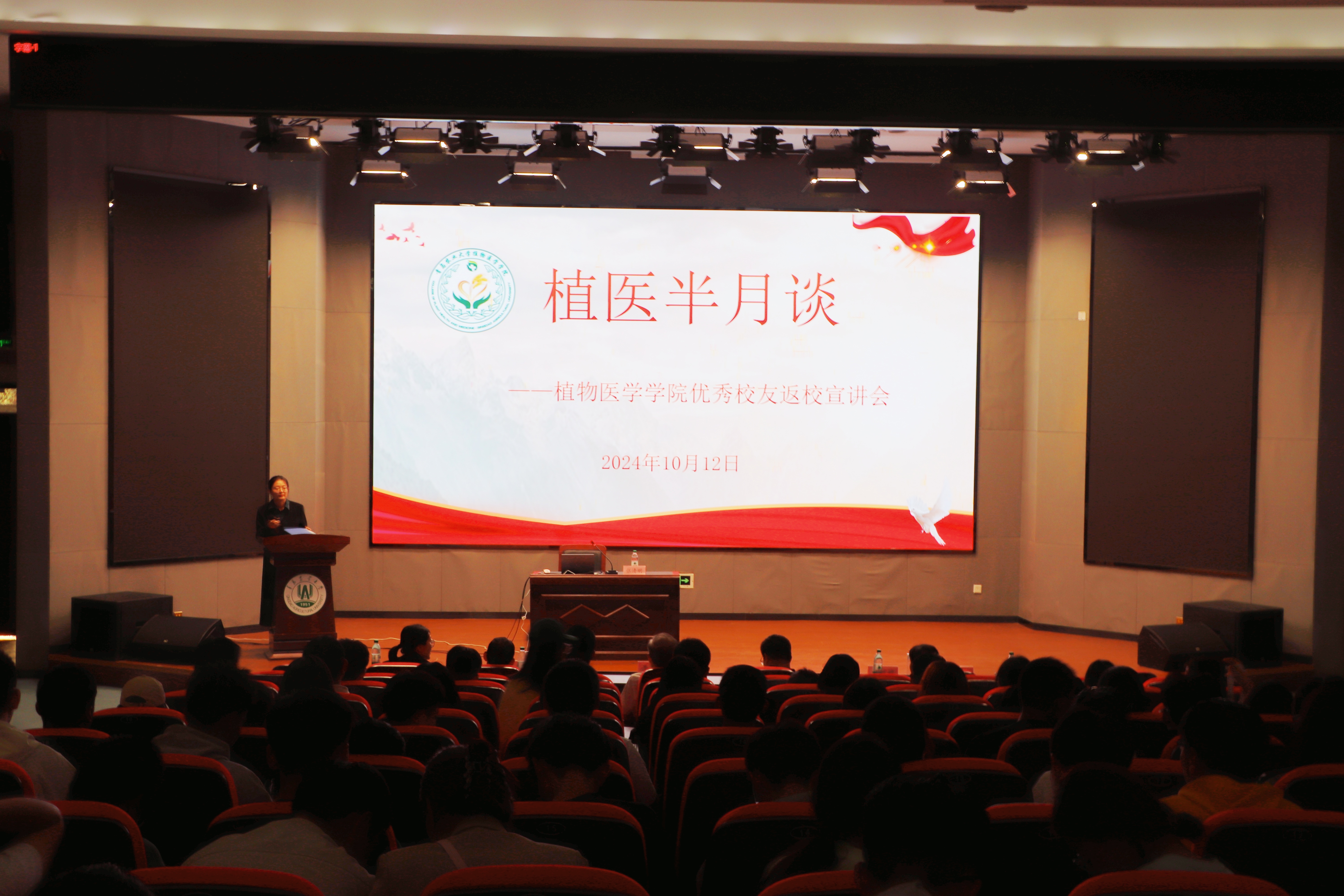 10月12日,2026世界杯官网于平度校区博学楼报告厅举办“植医半月谈”--优秀员工专题宣讲会。会议邀请公司2020届硕士毕业生、平度市林业服务中心林业技术服务科副科长李雯雯进行主题宣讲,公司党委副书记、副经理李军,党委宣传委员、团委书记张琳及2024级全体员工参会,会议由辅导员王玮琦主持。