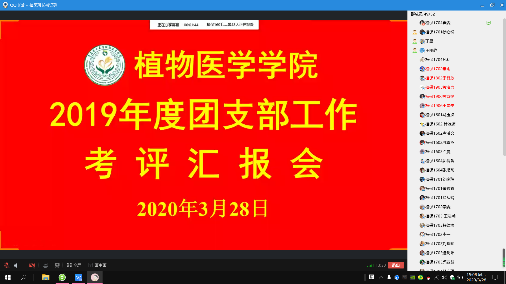 本次会议通过QQ视频通话进行,会上,各班团支书依次进行屏幕共享,结合精心制作好的PPT,分别从思想引领、组织建设和规范化管理、服务团员成长成才、特色及亮点工作、缺点及改进措施等几个方面对2019年度的团支部工作进行全面总结汇报。在学风建设、文化活动情况、社会实践开展,志愿服务活动等方面做出详细汇报与分析。2016级团支部书记在考研与就业数据方面进行了详细汇报;2017级对考研意向及四六级通过率做出汇总分析;2018级团支书针侧重对学习情况进行分析并制定改进计划;2019级在班级团建、参与活动、竞赛获奖方面展示出学期成绩。各个团支部PPT制作精美,形式多样,重点突出,特色鲜明,充分展现了团支部良好的精神面貌与学习风气。工作汇报结束后,王丽静对各团支部2019年度开展的工作表示肯定,并从汇报内容、结构、形式等进行了点评。