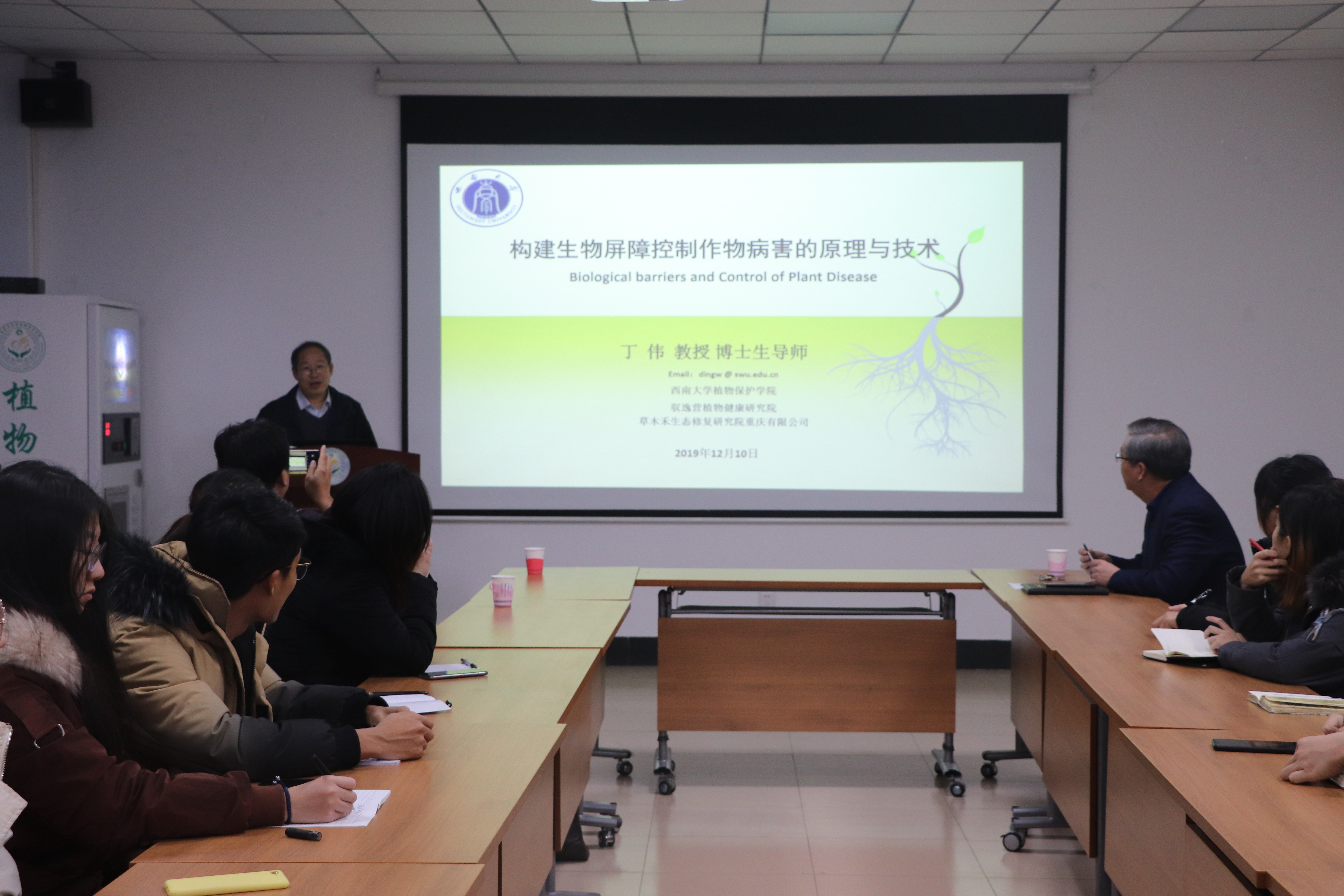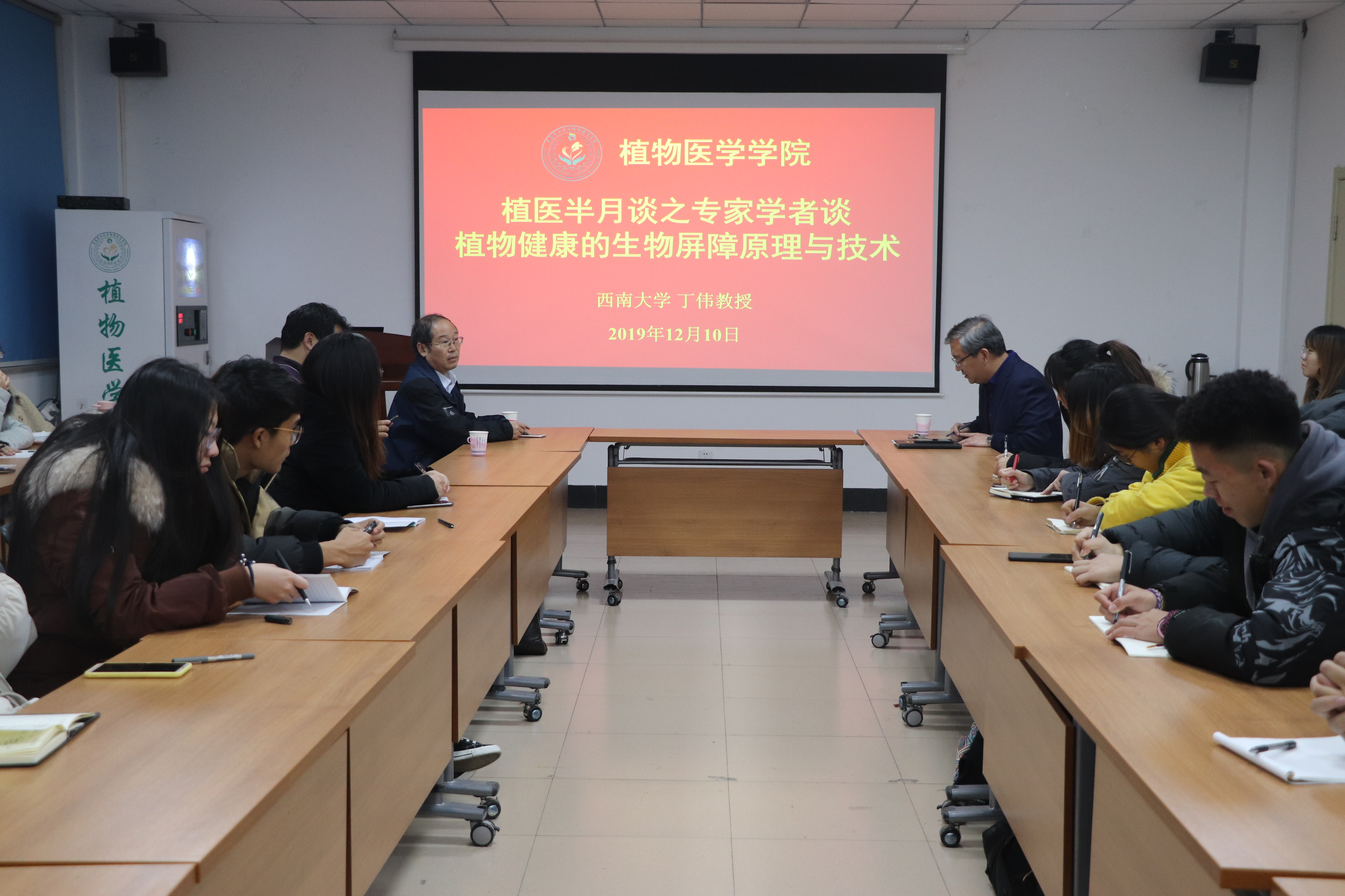 12月10日,2026世界杯官网于生物楼会议室N406举行第九场“植医半月谈”之专家学者谈植物健康的生物屏障原理与技术。西南大学教授丁伟受邀主讲,公司党总支副书记、副经理李军出席并主持报告会,公司2017级、2018级、2019级部分员工干部参加。