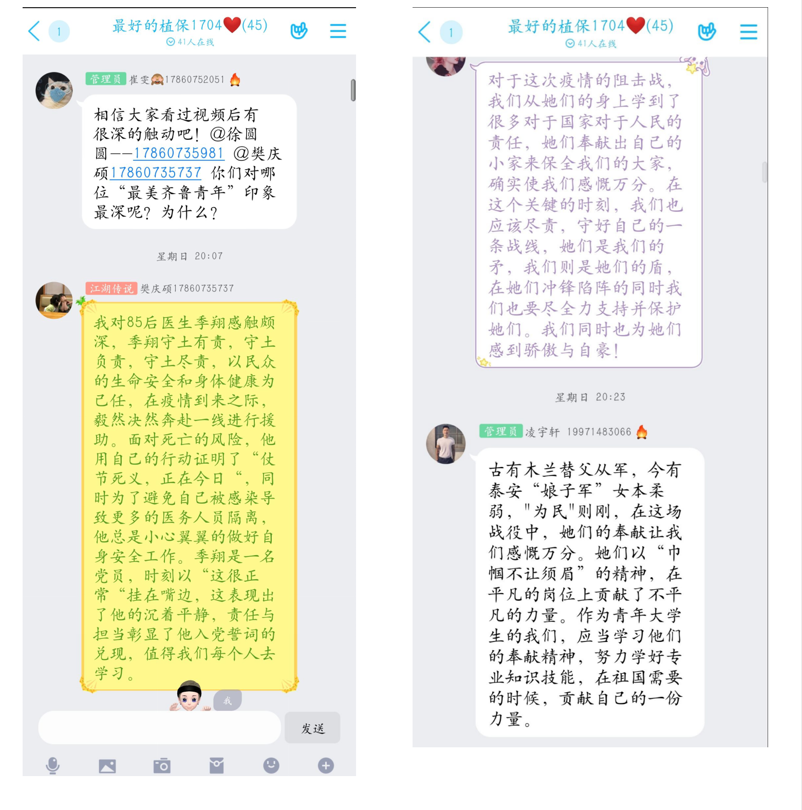 通过视频学习,同学们了解到山东省有1.62万青年志愿者投入到了抗“疫“一线,在灾难面前,青年志愿者们有着荣高的国家民族责任感,纷纷响应号召投身于志愿服务中,小到街道城区,大到县市政府,虽然志愿者们素不相识,但目标只有一个,那就是:保护好祖国,保护好最亲近的人。疫情期间,山东省委省政府始终坚决贯彻习近平总书记重要指示精神,坚决贯彻落实中央部署和省委要求,坚决服从全国防控大局,动员联系群众积极投身疫情防控,带领全省人民扛起大省责任担当,精心谋划,统筹推进疫情防控与复工复产,确保防控一线特别物资供应,展现出战疫必胜的勇气,能力和担当。通过齐鲁战疫典型人物事迹学习,感受逆行者们在疫情面前迎难而上,不畏艰难,万众一心的无畏精神与爱国之情。全体同学通过QQ、微信等群聊积极展开发言,纷纷表达出对抗疫英雄的敬佩与祝福。