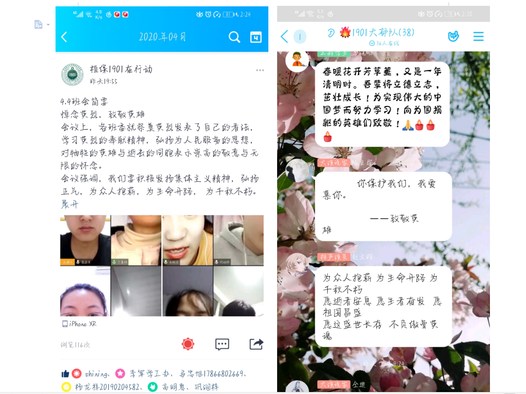 为加强精神文明建设,活动期间,公司全体同学借助中央“网上祭英烈”的互动平台,向烈士鞠躬、献花,寄托对先烈的哀思;在留言栏里撰写留言表达对革命先烈诚挚的敬意和深切的怀念。同时,各班级团支部通过QQ、微信群聊等聊天软件,开展了线上“致敬时代英雄”活动,活动以成语接龙形式展开,各团支部成员纷纷发言,同时,全体成员积极响应国家号召,于4月4日上午十点默哀三分钟,以表示对先烈的缅怀,对英雄的致敬,对逝者的哀悼。