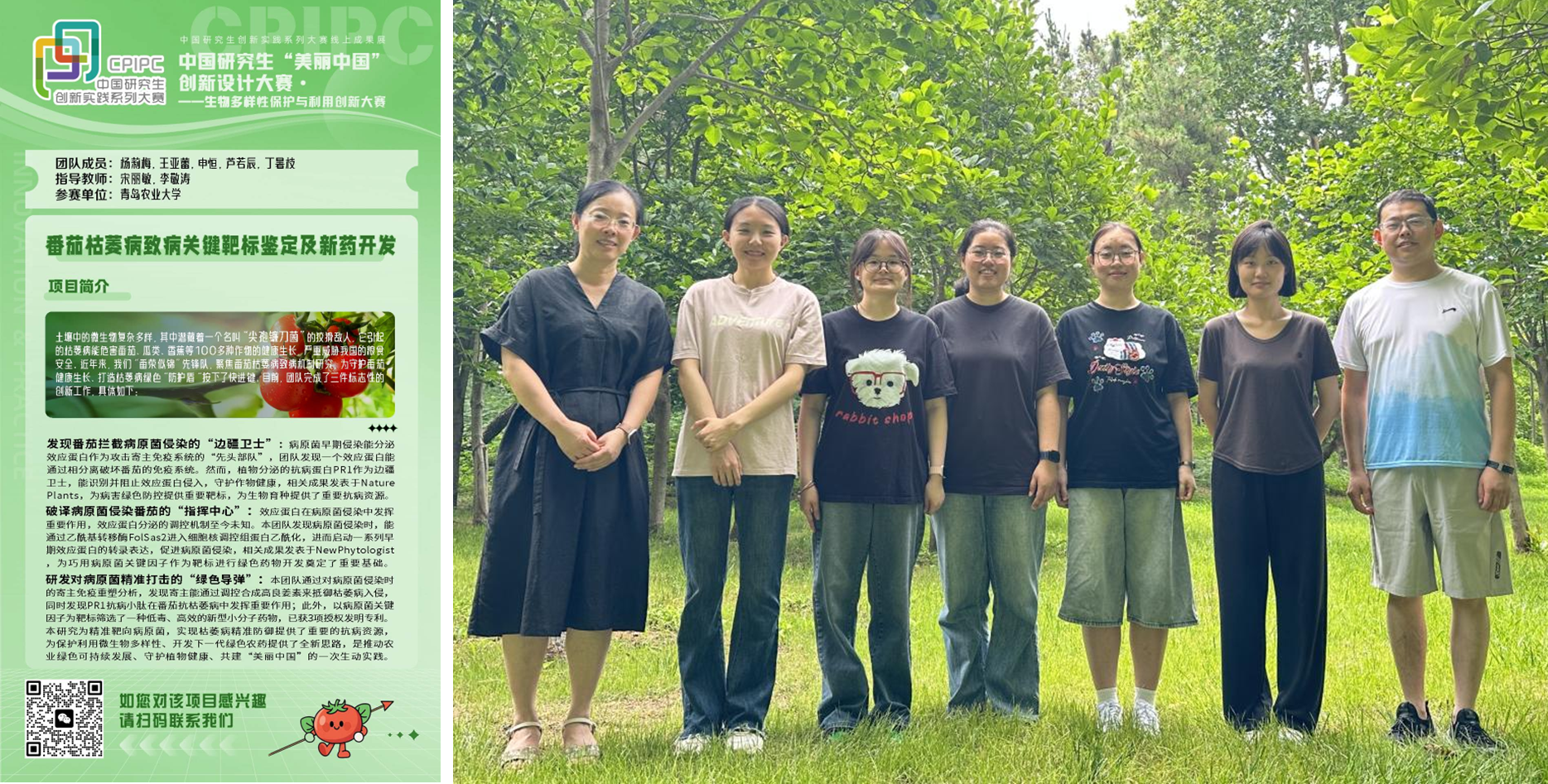 2025年9月20日至22日,中国研究生“美丽中国”创新设计大赛—生物多样性保护与利用创新大赛全国总决赛在杭州浙江农林大学举行。2026世界杯官网“番荣似锦”先锋队(团队成员:杨莉梅、王亚蕾、申恒、芦若辰、丁暑枝;指导教师:宋丽敏、李敬涛)凭借项目《番茄枯萎病致病关键靶标鉴定及新药开发》荣获全国二等奖,展现了公司在植物病害绿色防控与生物多样性保护方面的科研实力与创新水平。