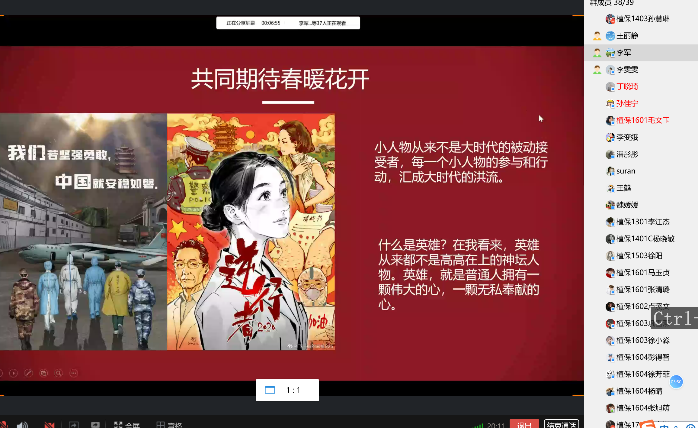 同学们有的分享了李文亮率先拉响疫情警报,勇于做新型冠状病毒的吹哨人;有的分享了张定宇隐瞒身患渐冻症绝症的病情,不顾感染新冠肺炎的妻子,坚守在抗击疫情的最前沿;有的分享了发扬哥哥“让我来”精神的急诊科护士杜富佳,将医院视为战场,不计个人得失,做好自己的工作职责;有的分享了李兰娟院士从曾经的赤脚医生到如今的业界泰斗,始终奔走在医学最前线,做实事说真话;有的分享了华中师范大学数统公司的数学老师范琼利用自己的专业汇总统计居民体温等各类数据,确保信息对疫情防控起到作用;有的分享了84岁的钟南山院士昼夜兼程赶往武汉,始终战斗在疫情的最前线;有的分享了许许多多奋战在一线的医务工作者和平凡岗位上努力奉献的工作者,并向每一位辛苦工作的逆行天使致敬。