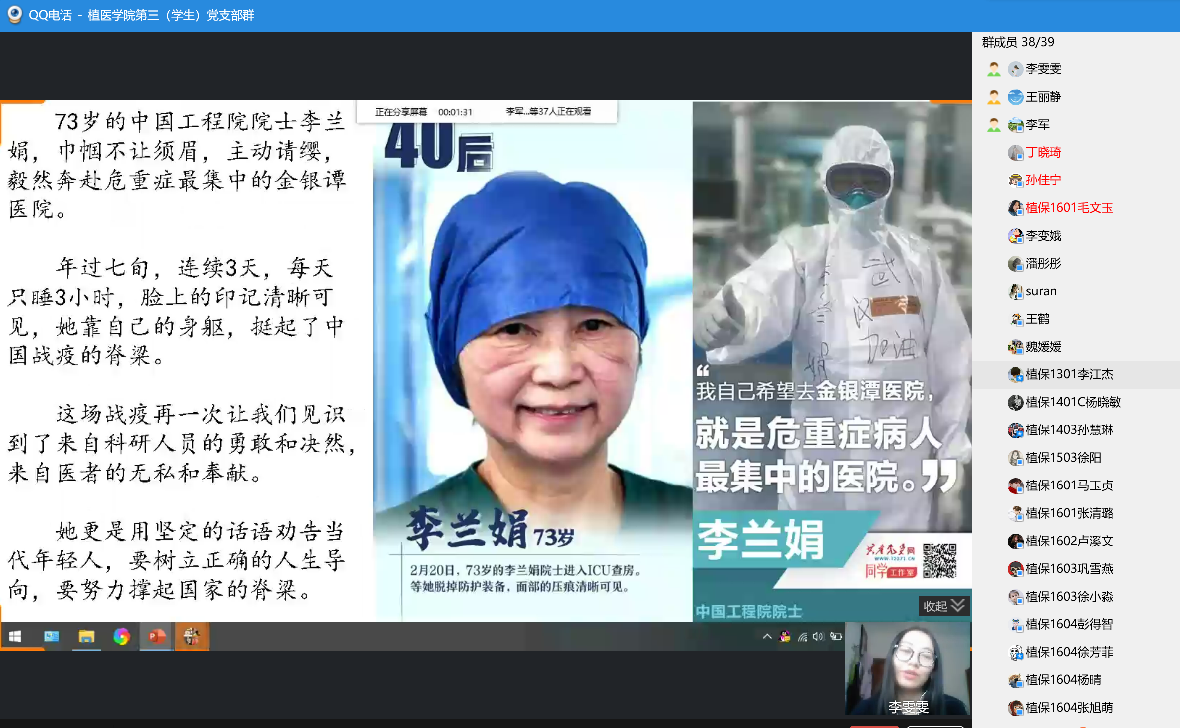 听完了支部党员的分享,许多同学纷纷发表个人感想体会:员工党员孙佳宁:“在我看来英雄从来都不是高高在上的神坛人物。英雄就是普通人拥有一颗伟大的心,一颗无私奉献的心。”员工党员杨晓敏:“90后的白衣天使,奋战在疫情第一线,同为90后的我们应该做点什么?疫情期间,我们可以去思考、沉淀,多读文献,分析自己的实验数据,为科研打下坚实的基础。”员工党员王雪成:“我们在家,不是休假,而是参加一场没有硝烟的战争,疫情防控不只是她、他们,更是我、我们,我们共同努力,去迎接春天的到来。”