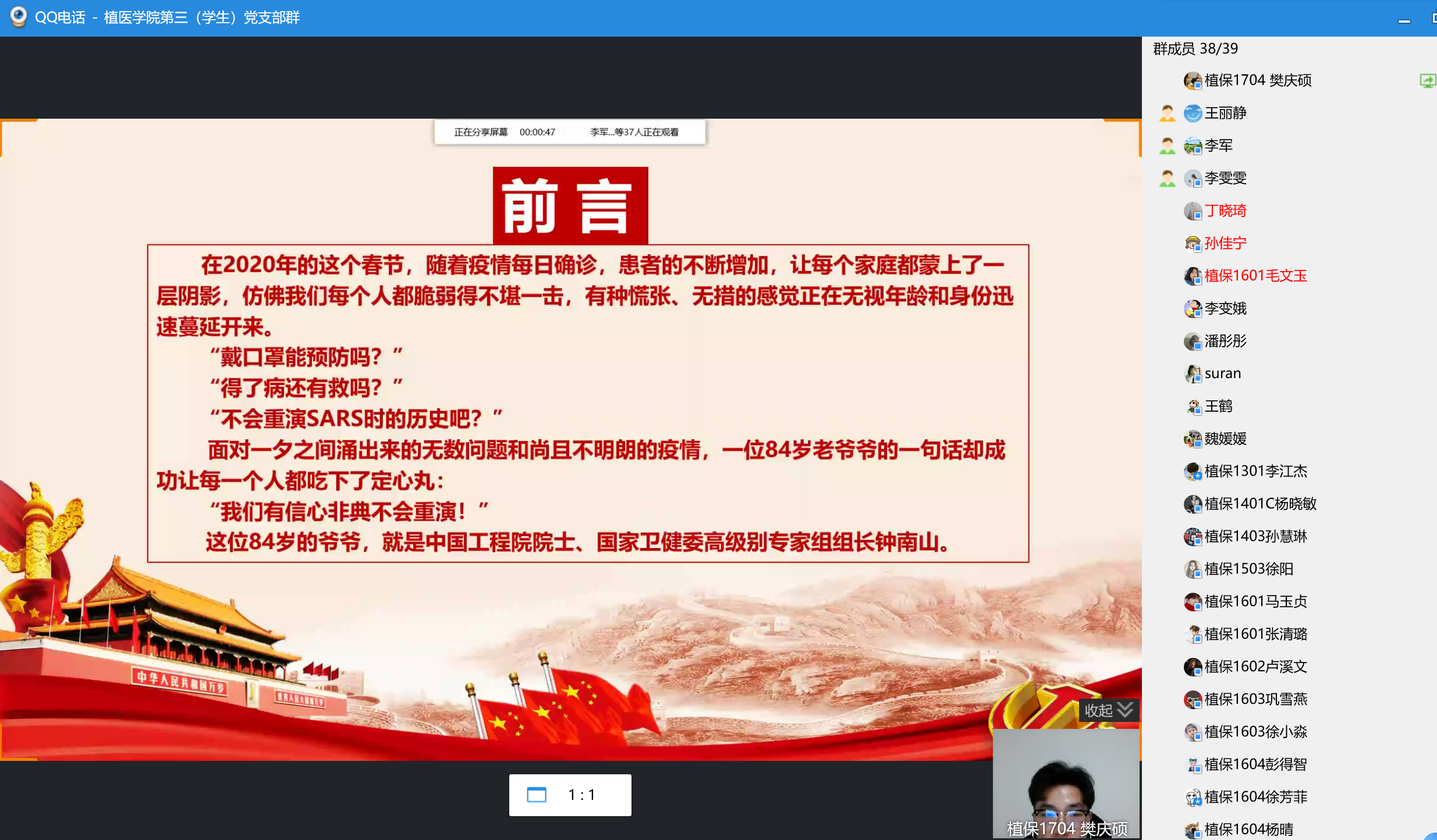 会上,七位员工党员通过精致的PPT与流畅的语言,从不同角度与大家分享自己在疫情期间的见闻感悟,呼吁党员同志们充分发挥先锋模范作用,为打赢疫情防控阻击战贡献青年党员的力量。