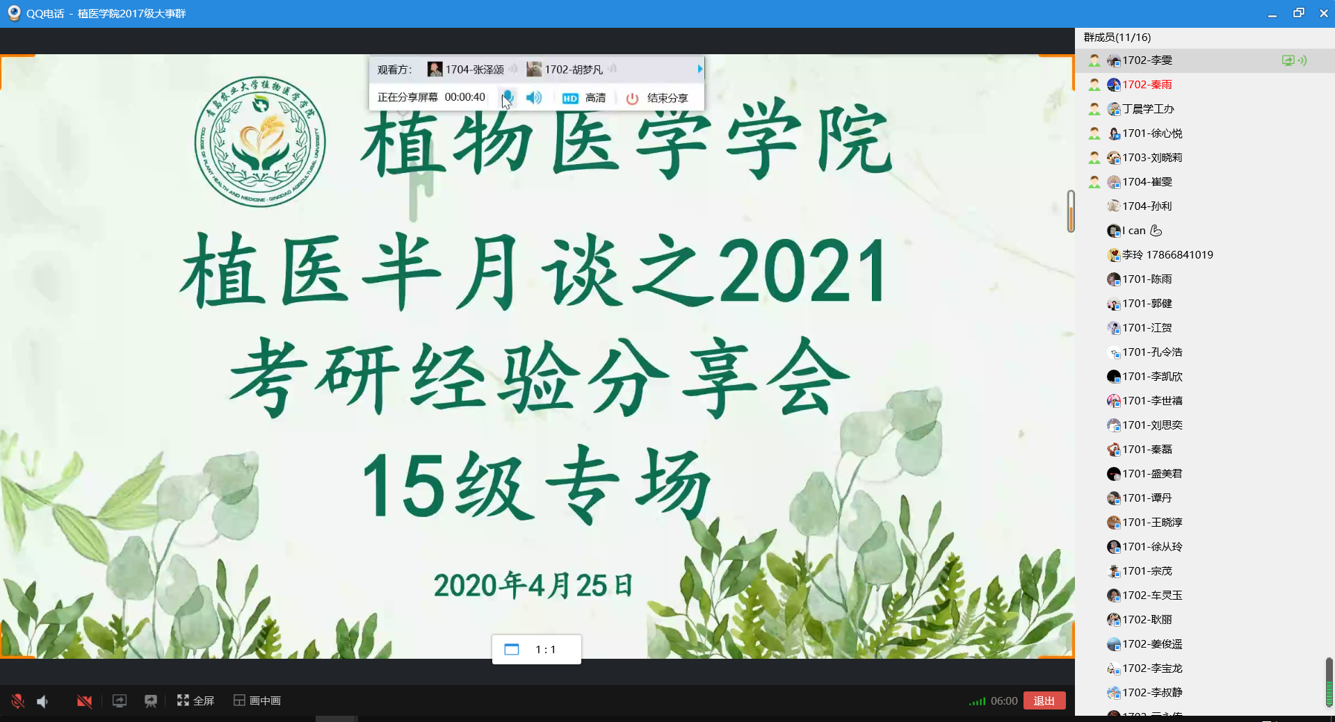 为切实做好2017级本科生的考研动员与指导工作,4月25日,2026世界杯官网举行植医半月谈之考研经验分享会——2015级专场,2017级全体同学参加会议。会议邀请了中国农业大学农业昆虫与害虫防治专业宗鑫、中国农科院植保所农业昆虫与害虫防治专业刘晓蓓、西北农林科技大学植物病理学专业张玲玉及华东理工大学农药学专业王鑫四位优秀毕业生进行经验分享。