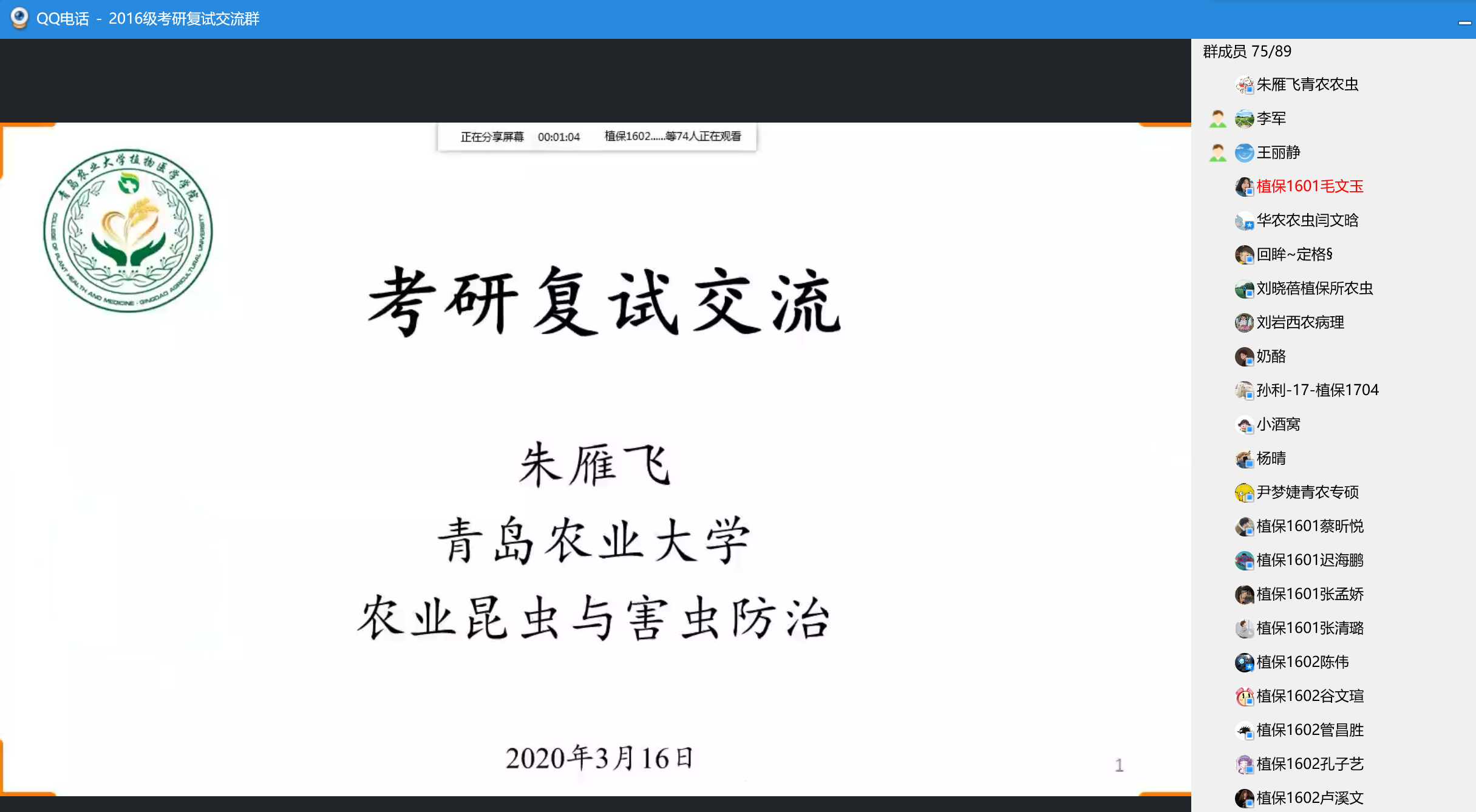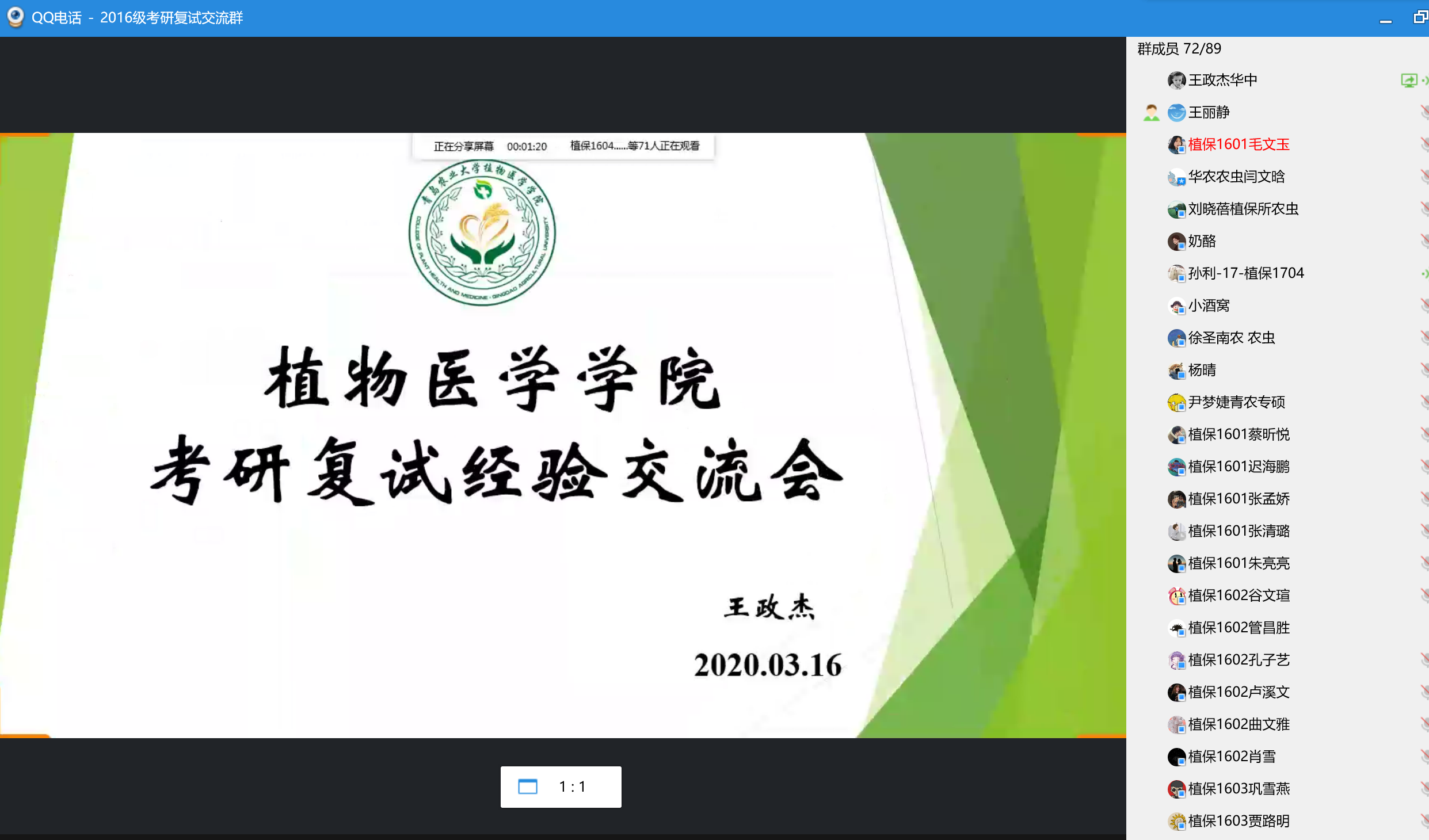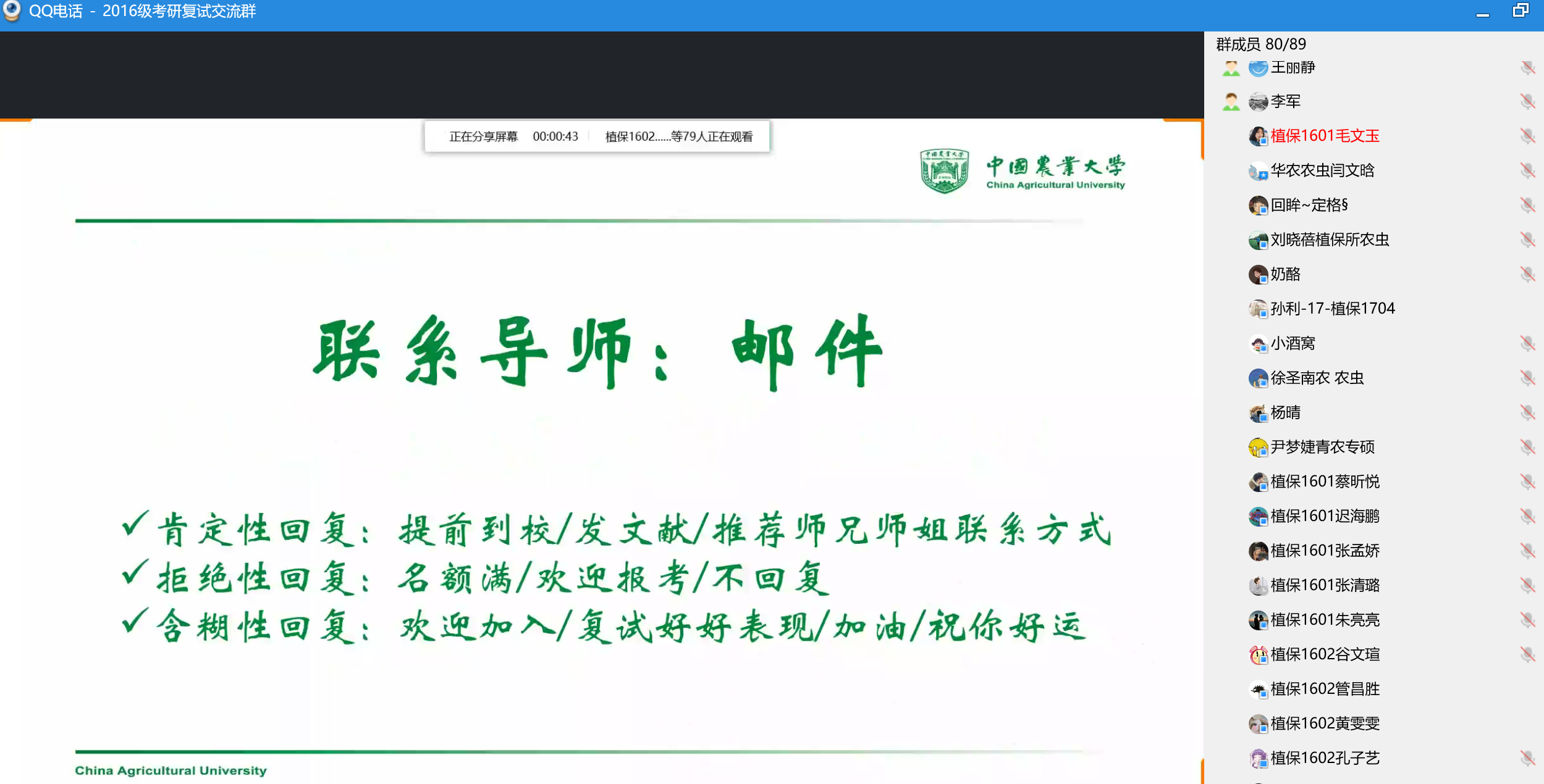 会上,中国农业科公司植物保护研究所刘晓蓓,中国农业大学研究生宗鑫,南京农业大学研究生徐圣,西北农林科技大学研究生刘岩,华中农业大学研究生王政杰、闫文晗,世界杯2026官方网站研究生朱雁飞、尹梦婕依次通过QQ群语音屏幕共享,以PPT形式向在场同学们分享了考研复试经验。他们结合自己考研复试的亲身经历,从复试流程、面试笔试、复试英语、联系导师、考前准备、考试心态等方面进行了深入细致的讲解。其中公司2017届毕业生华中农业大学研究生,大连理工大学拟录取博士研究生王政杰同学结合自己考研、考博成功的经历就如何找到适合自己的方向,更好地进行自己的学涯规划方面进行了交流;宗鑫从面试礼仪、实验技能和专业英语准备等方面重点做了分享;尹梦婕同学结合自己在考研调剂方面的经验,在调剂信息获取、调剂流程、调剂公司选择、复试准备等方面做了分析介绍。王丽静进行总结,希望2016级考生们密切关注相关院校招生信息,主动联系导师,积极备战,调整心态,打赢考研最后一战。