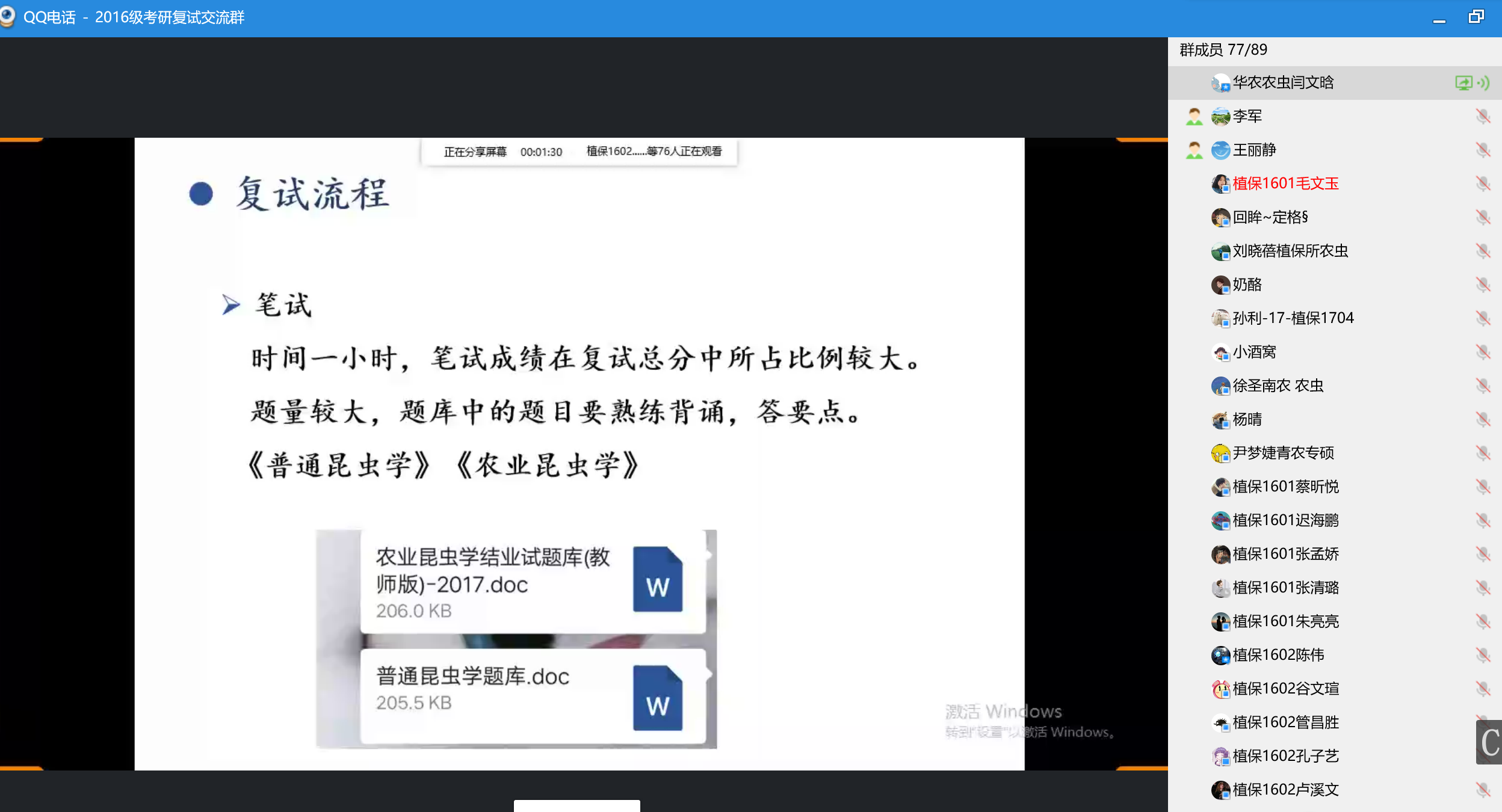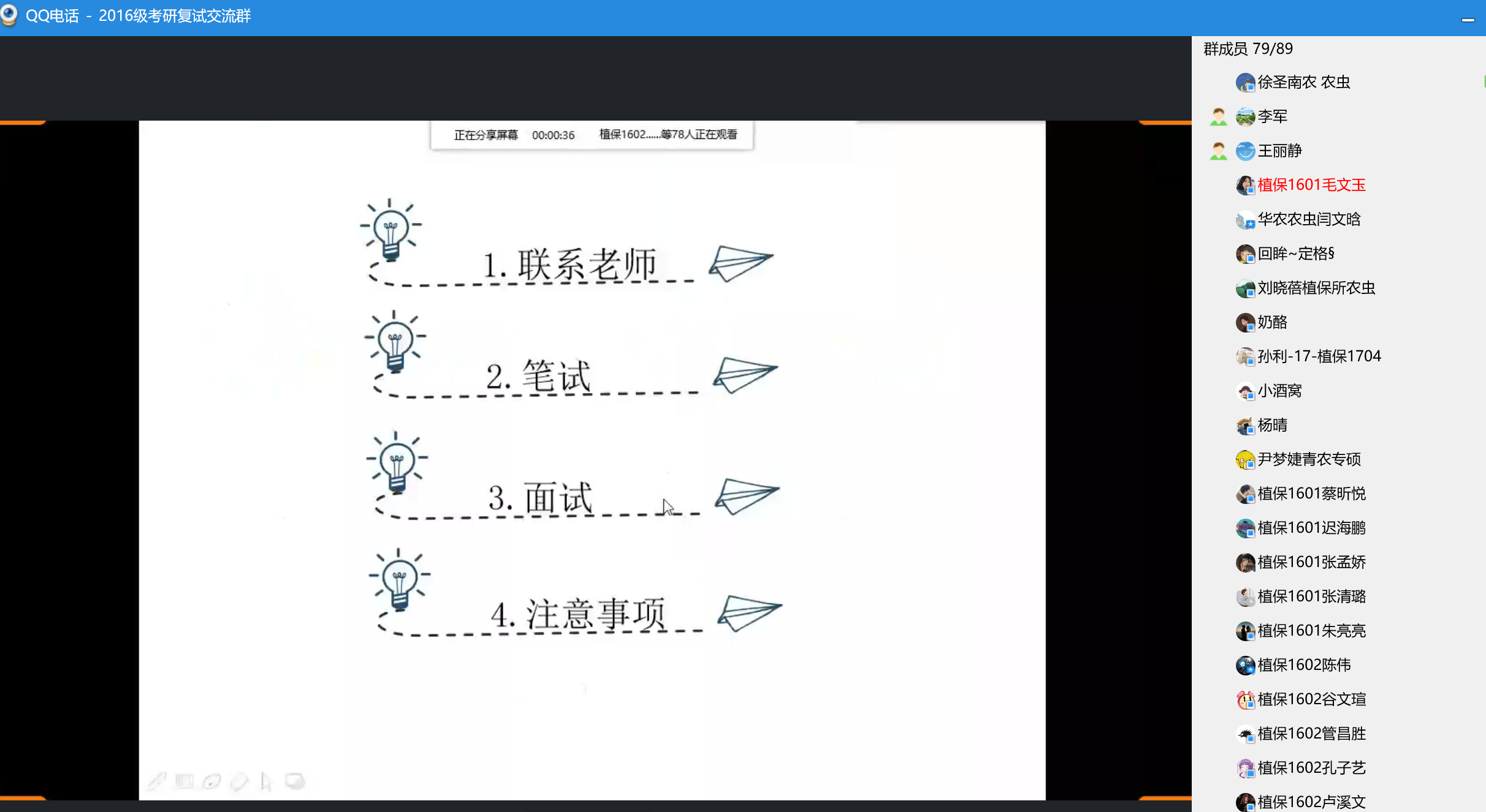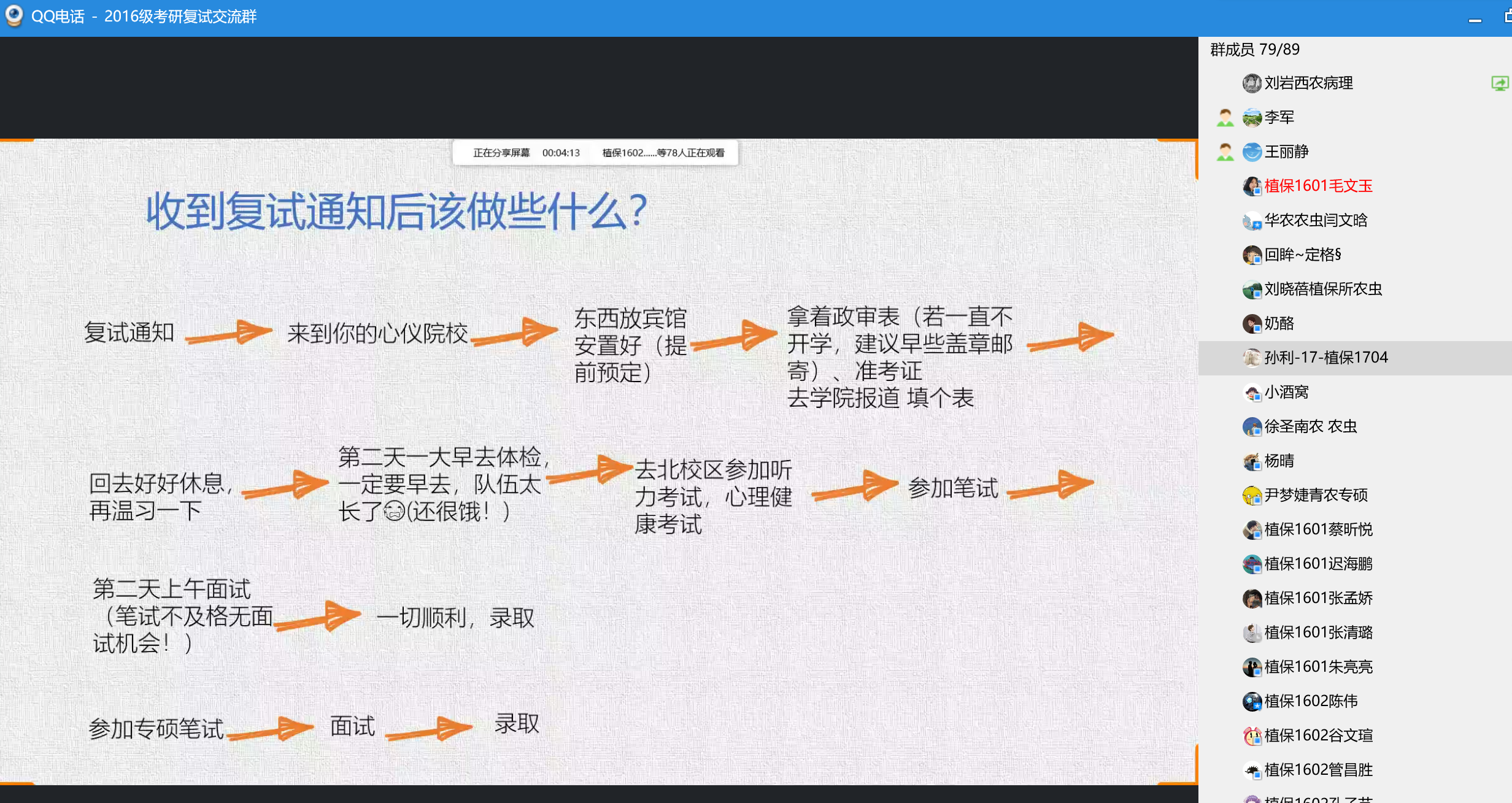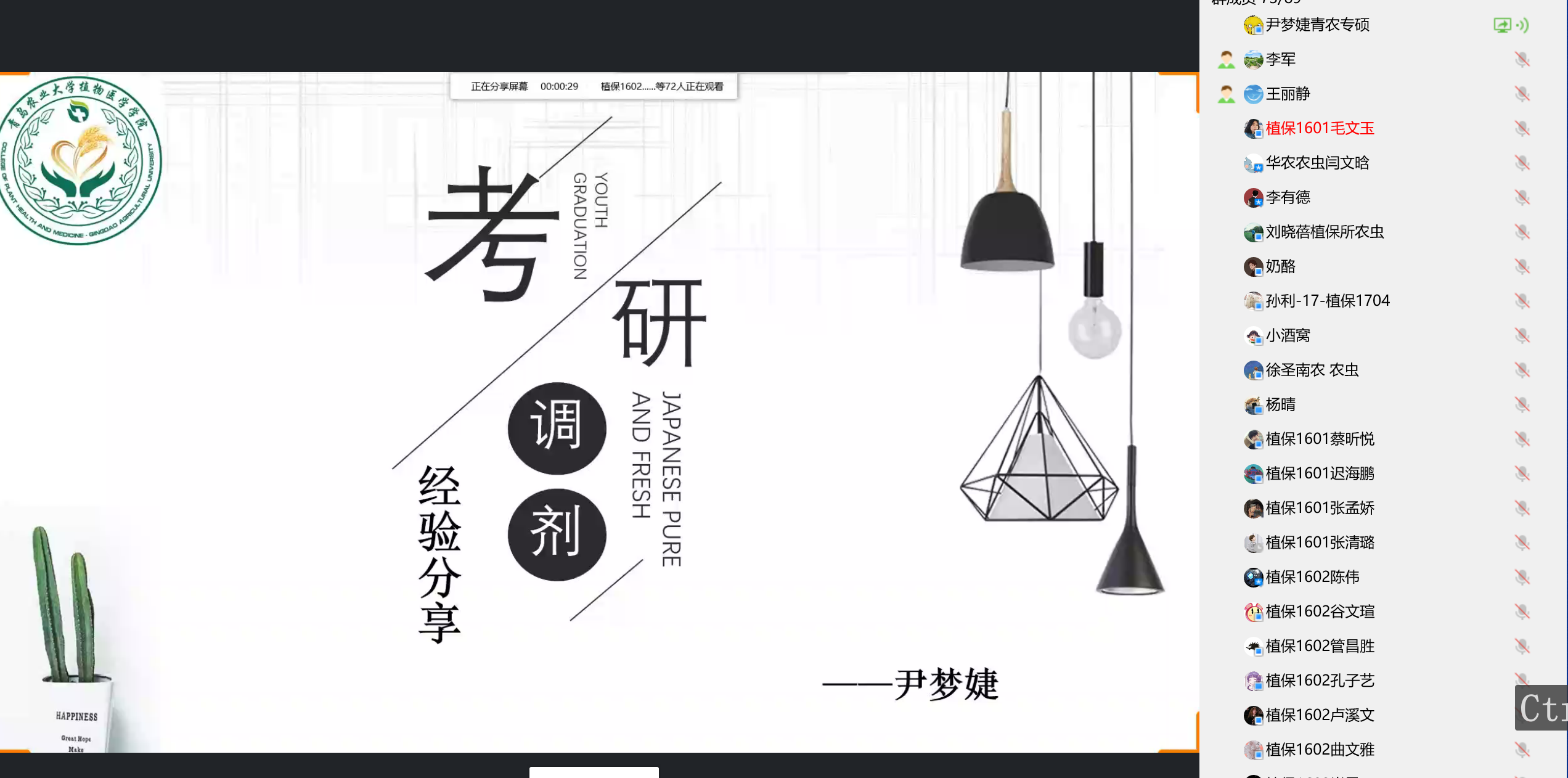 会上,中国农业科公司植物保护研究所刘晓蓓,中国农业大学研究生宗鑫,南京农业大学研究生徐圣,西北农林科技大学研究生刘岩,华中农业大学研究生王政杰、闫文晗,世界杯2026官方网站研究生朱雁飞、尹梦婕依次通过QQ群语音屏幕共享,以PPT形式向在场同学们分享了考研复试经验。他们结合自己考研复试的亲身经历,从复试流程、面试笔试、复试英语、联系导师、考前准备、考试心态等方面进行了深入细致的讲解。其中公司2017届毕业生华中农业大学研究生,大连理工大学拟录取博士研究生王政杰同学结合自己考研、考博成功的经历就如何找到适合自己的方向,更好地进行自己的学涯规划方面进行了交流;宗鑫从面试礼仪、实验技能和专业英语准备等方面重点做了分享;尹梦婕同学结合自己在考研调剂方面的经验,在调剂信息获取、调剂流程、调剂公司选择、复试准备等方面做了分析介绍。王丽静进行总结,希望2016级考生们密切关注相关院校招生信息,主动联系导师,积极备战,调整心态,打赢考研最后一战。